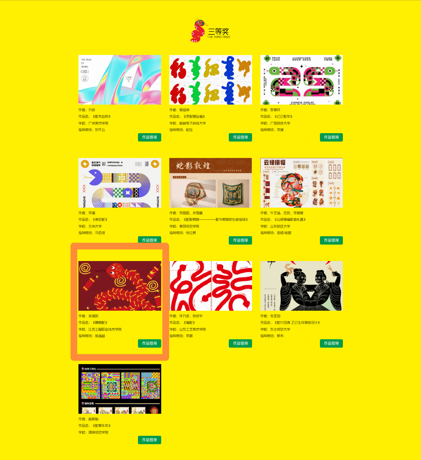 本届比赛自今年9月启动报名,来自全国各高校的7130件学生作品和504件特邀作品进入评选。评委从创作的创新性、文化性和美观性等创意角度进行评价,最终评出2名一等奖、6名二等奖、10名三等奖、优秀奖若干。吴德凯同学作品《鞭炮蛇》根据对蛇年的结合和过年的氛围进行联想,将鞭炮和蛇进行同构设计,富有中国传统节日特色。