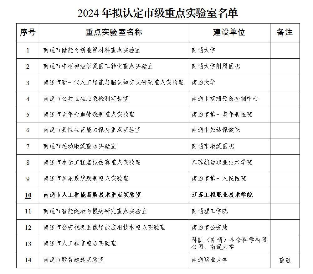 近日,南通市科学技术局公布了2024年拟认定的市级重点实验室名单,信息工程学院申报的“南通市人工智能新质技术重点实验室”成功认定,标志着信息工程学院在市级科研平台建设方面取得了新的突破。