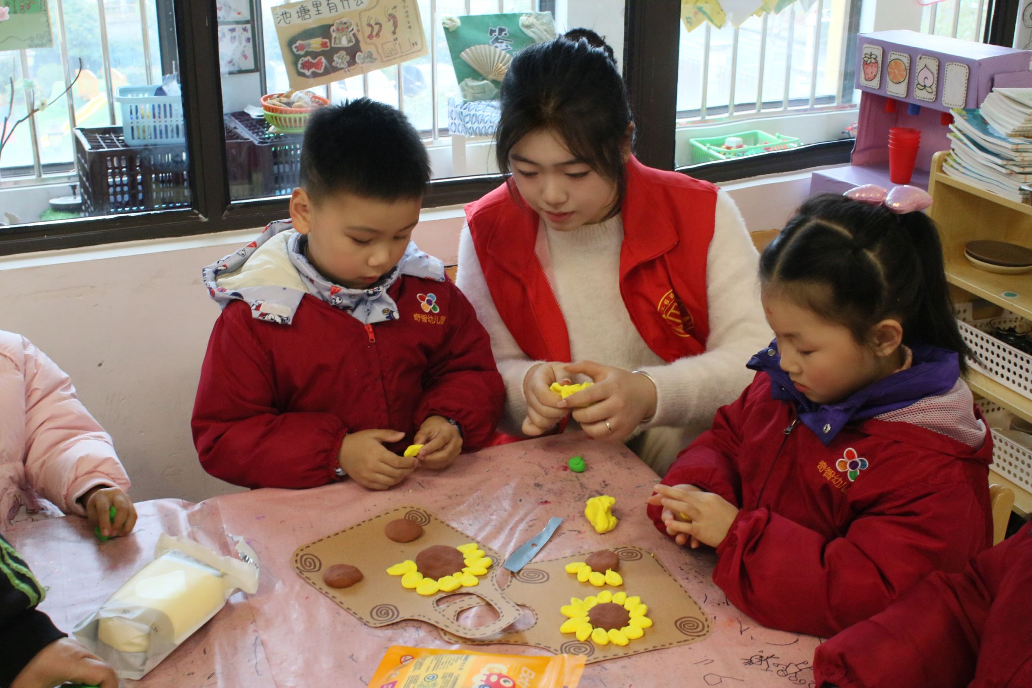 故事分享结束后,志愿者唐欣蕊与团队成员带领孩子们进入手工实践环节。他们以“向日葵”为主题,手把手教孩子们用超轻黏土捏制花朵。志愿者们耐心示范揉捏、塑形、装饰等步骤,孩子们全神贯注地创作,一朵朵色彩鲜艳的“向日葵”在欢声笑语中诞生。临近活动尾声,孩子们表示,要像向日葵一样,把快乐带给身边的人。