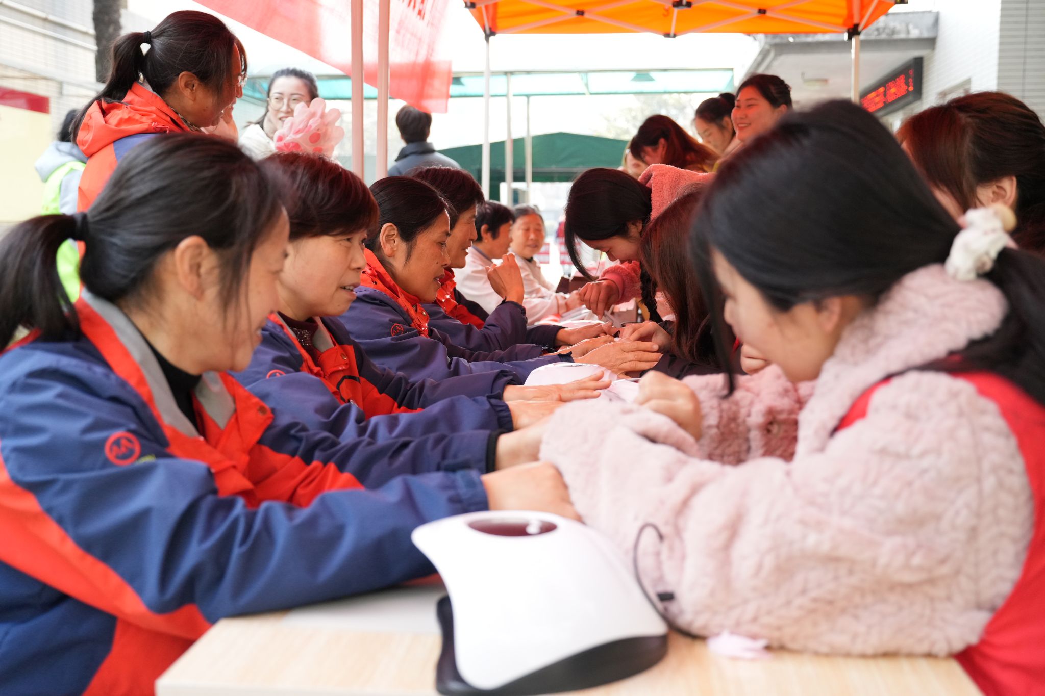 活动当天,学校美妆美甲社团的学生们为宿管阿姨和保洁阿姨们提供免费手部护理和美甲服务。平日里忙于工作的她们,难得有机会放松身心,享受片刻的美丽时光。看着自己精心修饰过的双手,阿姨们脸上洋溢着幸福的笑容,纷纷感叹:“这还是第一次做美甲呢,真漂亮!”