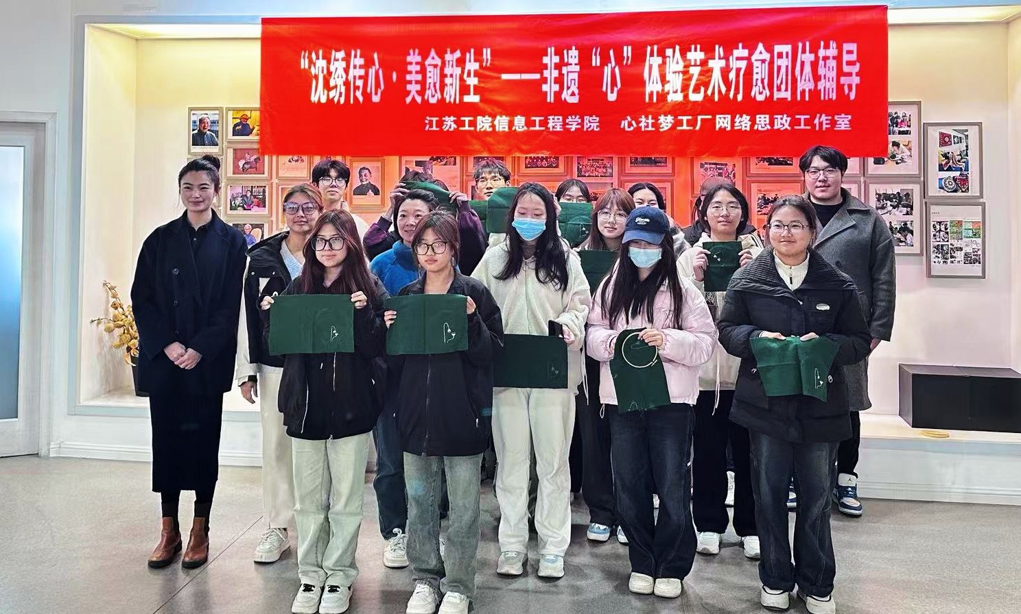 3月20日下午,信息工程学院心社梦工厂网络思政工作室主办的艺术疗愈活动在文博馆沈寿刺绣技艺展厅上演。此次活动以“沈绣传心·美愈新生”为主题,国家级非遗传承人张蕾老师、信息工程学院辅导员、工作室负责人孟晋老师、经济管理学院辅导员顾胜楠老师以及30名学生共同参与。