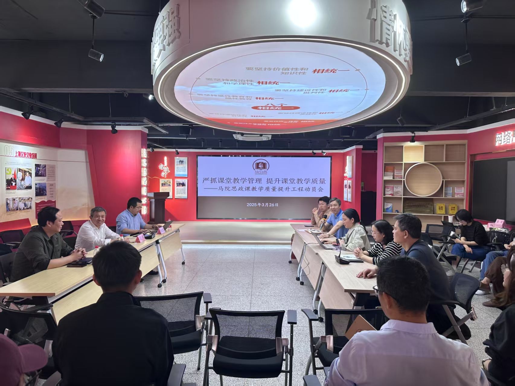 3月26日下午,马克思主义学院召开“思政课教学质量提升行动计划”动员部署会议。校质量管理办公室主任倪红耀,教务处副处长黄海涛,原教务处处长、关工委委员潘绍来参加会议。学院副院长朱建主持会议。
