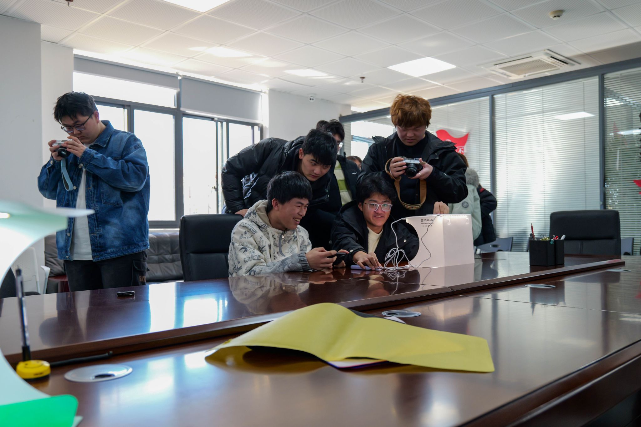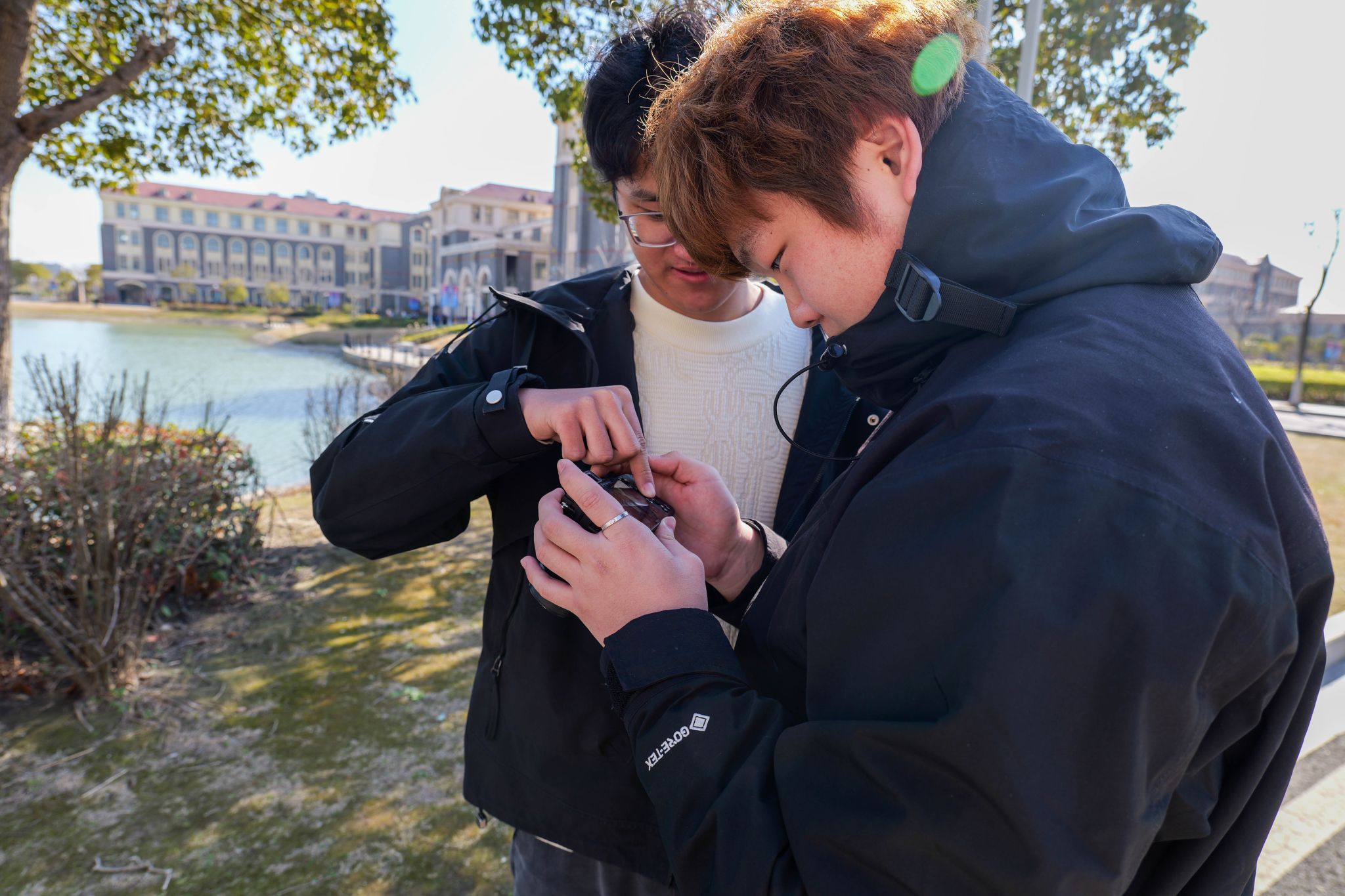 在会议室中,同学们架起柔光灯,铺上纯色幕布,专注调试相机参数,对着小巧摆件和盆栽按下快门,室内光影交错,艺术氛围拉满。户外实践环节则将课堂延伸至校园各处,在樱花大道、图书馆等标志性地点,学员们运用所学知识进行现场创作,用镜头记录校园春日盛景。