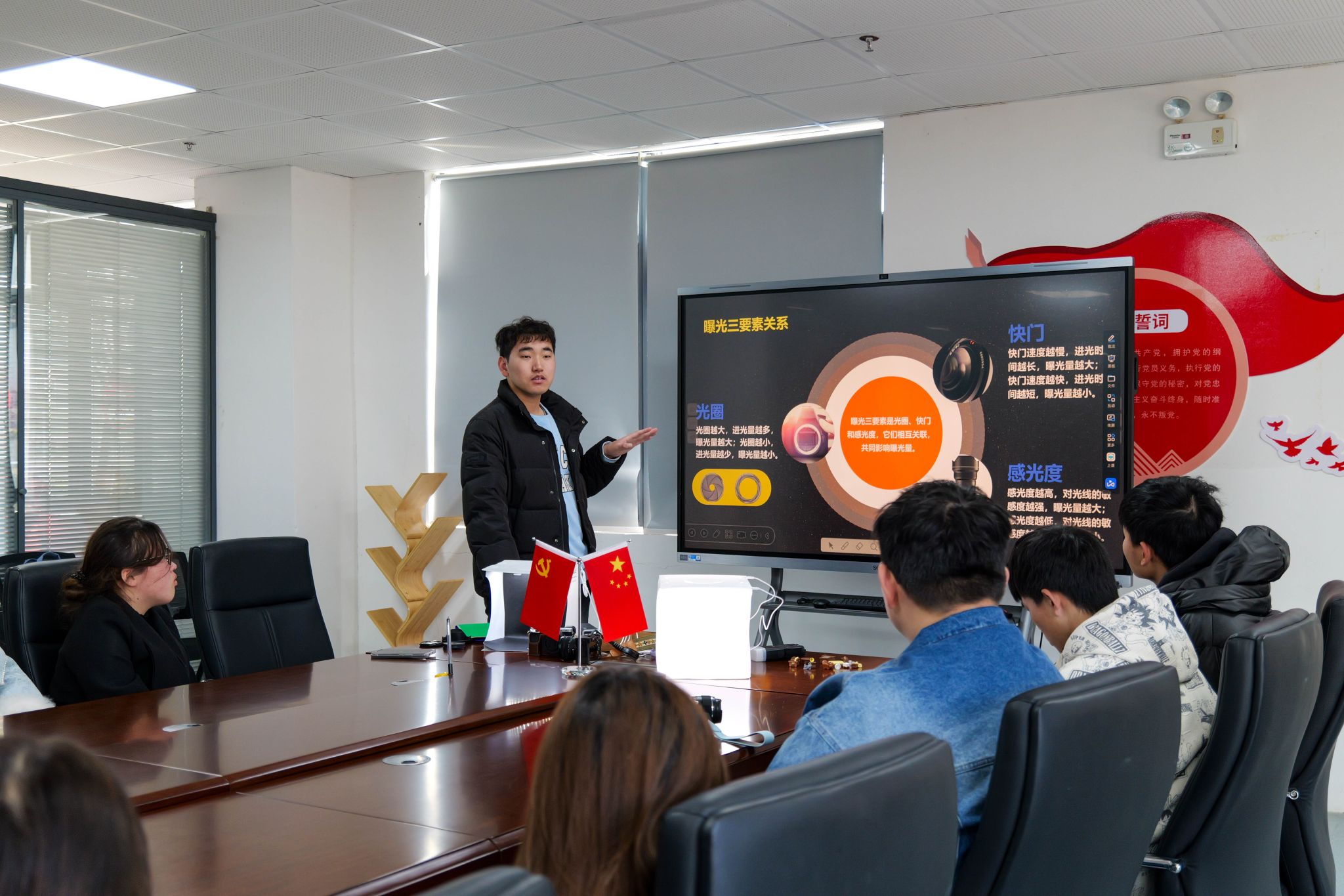 在基础理论教学环节,协会会长邵国银以“让镜头会说话”为主题,通过生活案例解析与趣味互动,将专业知识转化为可感知的视觉语言。他将相机比作画家的调色盘,通过调节镜头的“眼睛”大小(光圈),现场展示背景虚化效果的变化;用“时间凝固器”比喻快门速度,通过拍摄运动物体的对比实验,让学员理解如何定格瞬间或表现动感;通过调节灯光颜色(色温),让学员直观感受:暖黄色灯光如何营造温馨氛围,冷蓝色光线怎样传递宁静感觉。结合校园建筑、花卉等实景照片,邵国银用“九宫格游戏”解析经典构图法则,教大家如何通过线条引导观众视线,将普通场景变成有故事感的画面。