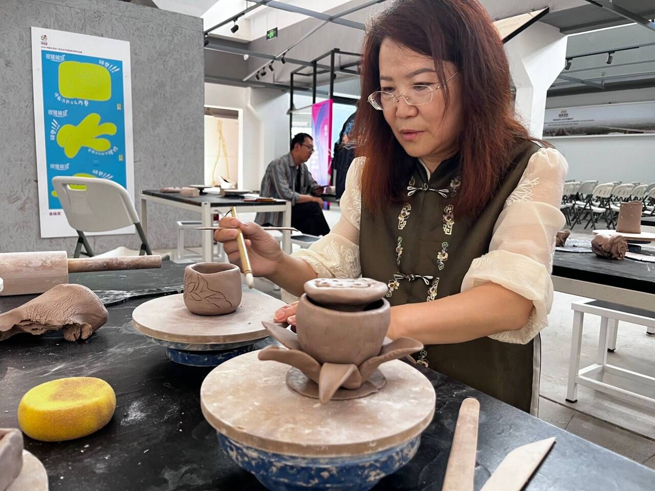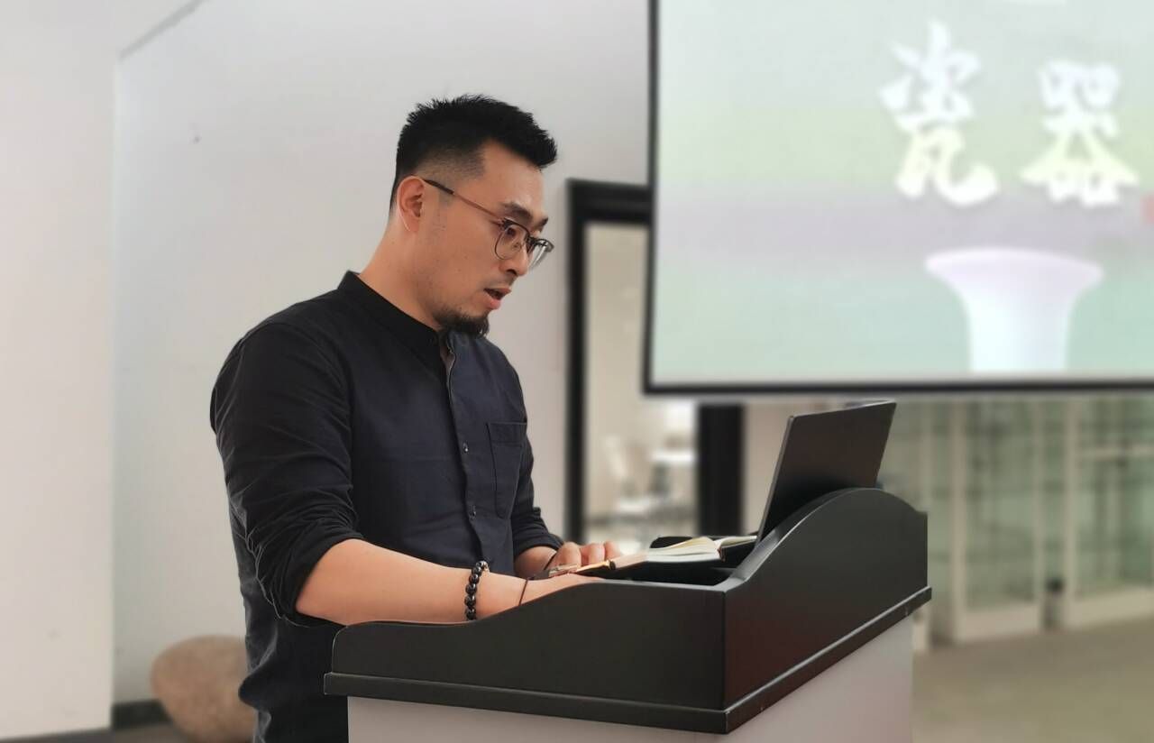陶廉互鉴,溯源正心。艺术设计学院挂职院长李楠对思廉日主题文化进行了解构说明,带领大家从色彩、器型、纹样多角度鉴赏了故宫藏品素三彩海蟾纹三足洗,分享了个人的思考,引发参会老师深刻共鸣。在“清风陶艺”环节,王金灿老师向大家展示了竹节杯、清莲杯的制作工序要点,指导老师们现场体验陶艺的魅力。