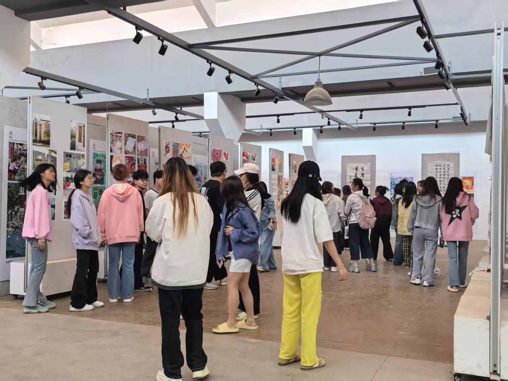 本次大赛自发布以来,学子热情高涨,迅速掀起艺术创作热潮,共收到全校学生投稿作品百余件,涵盖绘画、书法(篆刻)、摄影、各种工艺设计品(剪纸、编织)、雕塑(陶艺)、DV快闪作品等多种艺术形式,构建起多元交融的艺术展示平台。参赛作品紧扣时代脉搏,既有对传统文化的创新诠释,也有对社会热点的深刻关注,更有充满科技感的数字作品展现未来想象,充分彰显了学生们的跨界思维与艺术张力。现场同步举办优秀作品展,吸引百余名师生驻足欣赏,零距离感受艺术魅力。