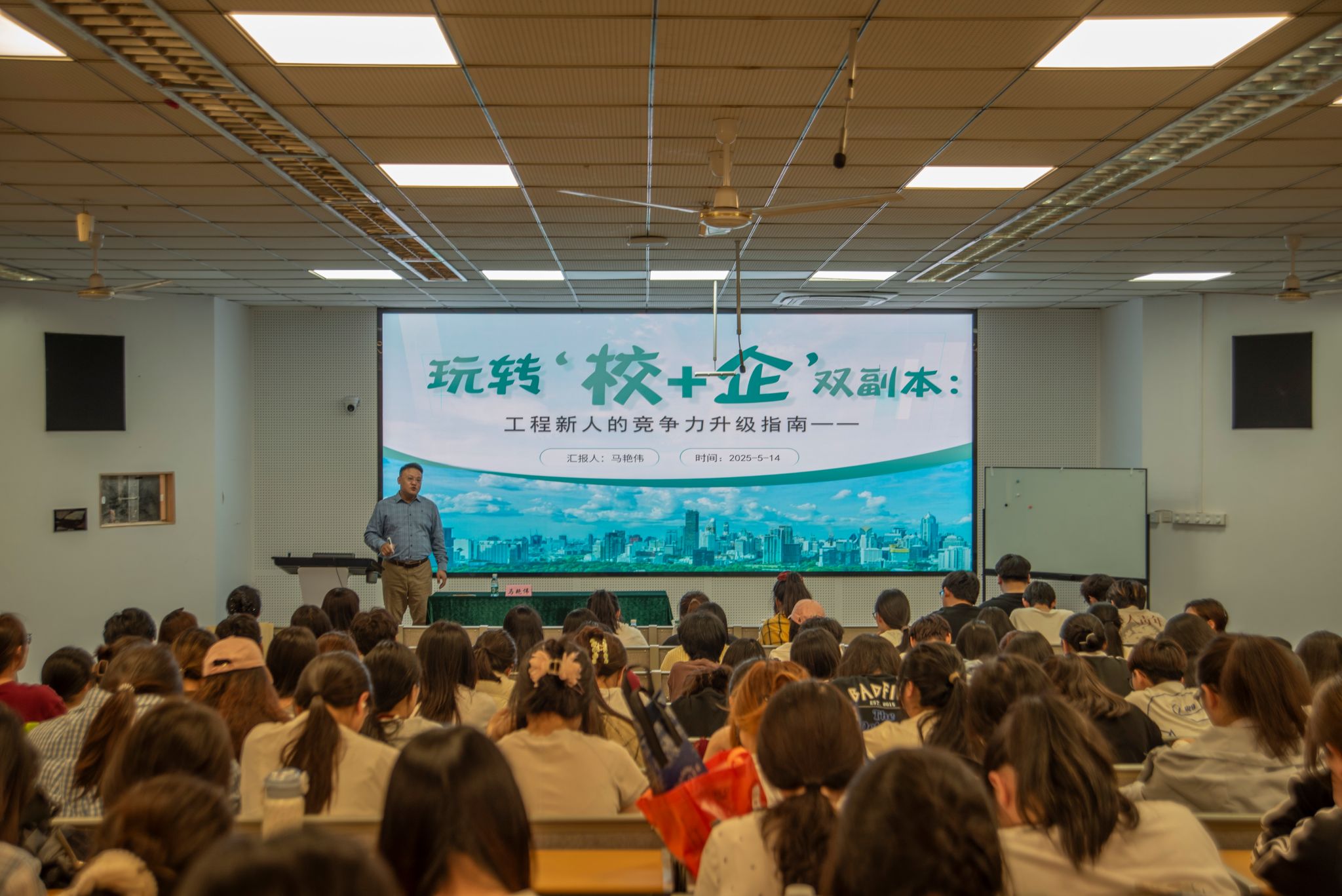 马艳伟以《玩转'校+企'双副本:工程新人的竞争力升级指南》为题,采用游戏化视角围绕“求职行动及规划”这一核心主题展开讲解,通过大量生动的案例和实用的技巧分享,为同学们带来了一场干货满满的就业指导课。现场互动气氛良好,师生反响热烈。