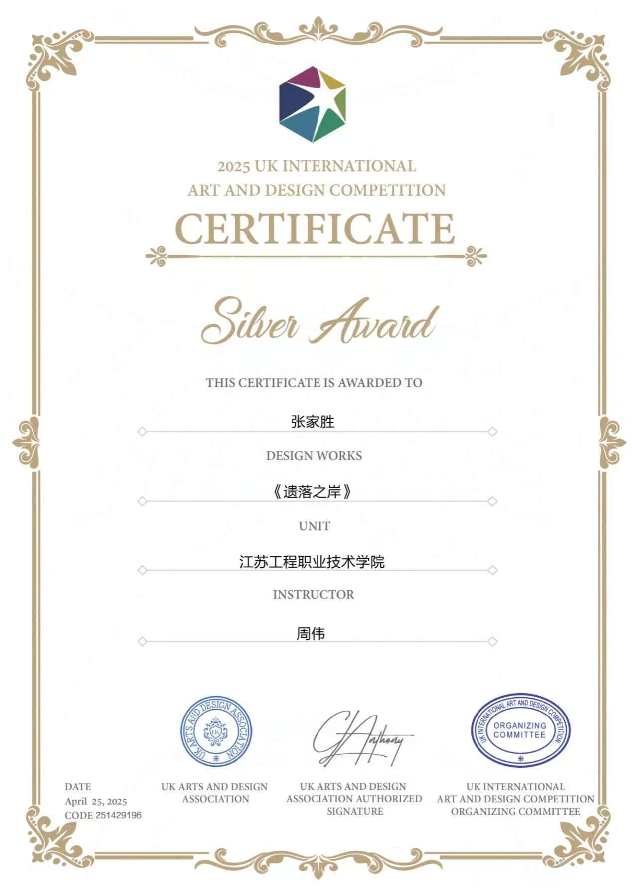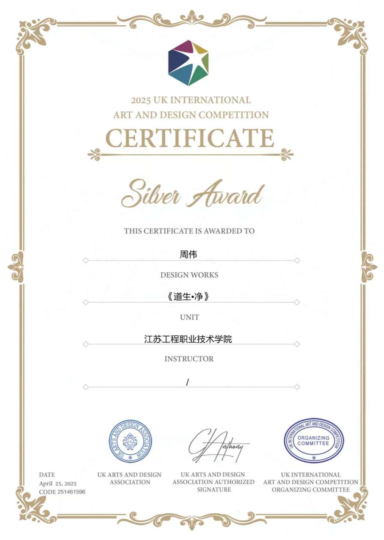 近日,我校艺术设计学院在2025英国国际艺术设计大赛创佳绩。环境空间团队周伟老师及其指导的学生在大赛中成绩斐然。周伟老师作品《道生·净》获传统美术类专业组银奖,并荣获优秀指导教师奖,其指导学生张家胜《遗落之岸》获银奖,武一凡《橙暮山居》、芦晓颖《绛染残荷》作品获铜奖,汤艺菲《蓝色疆土》、吴昊远《光荫交响》获优秀奖。
