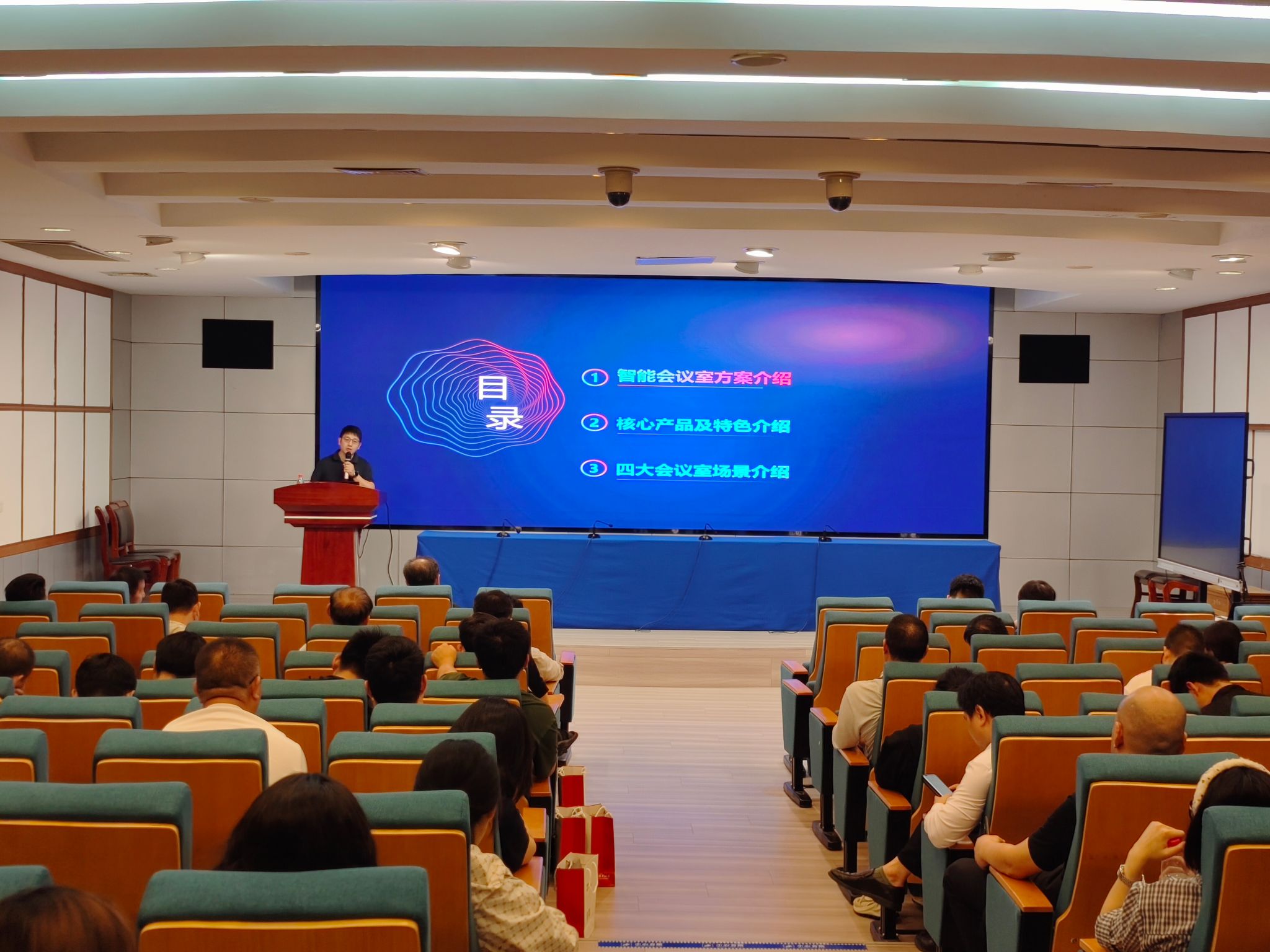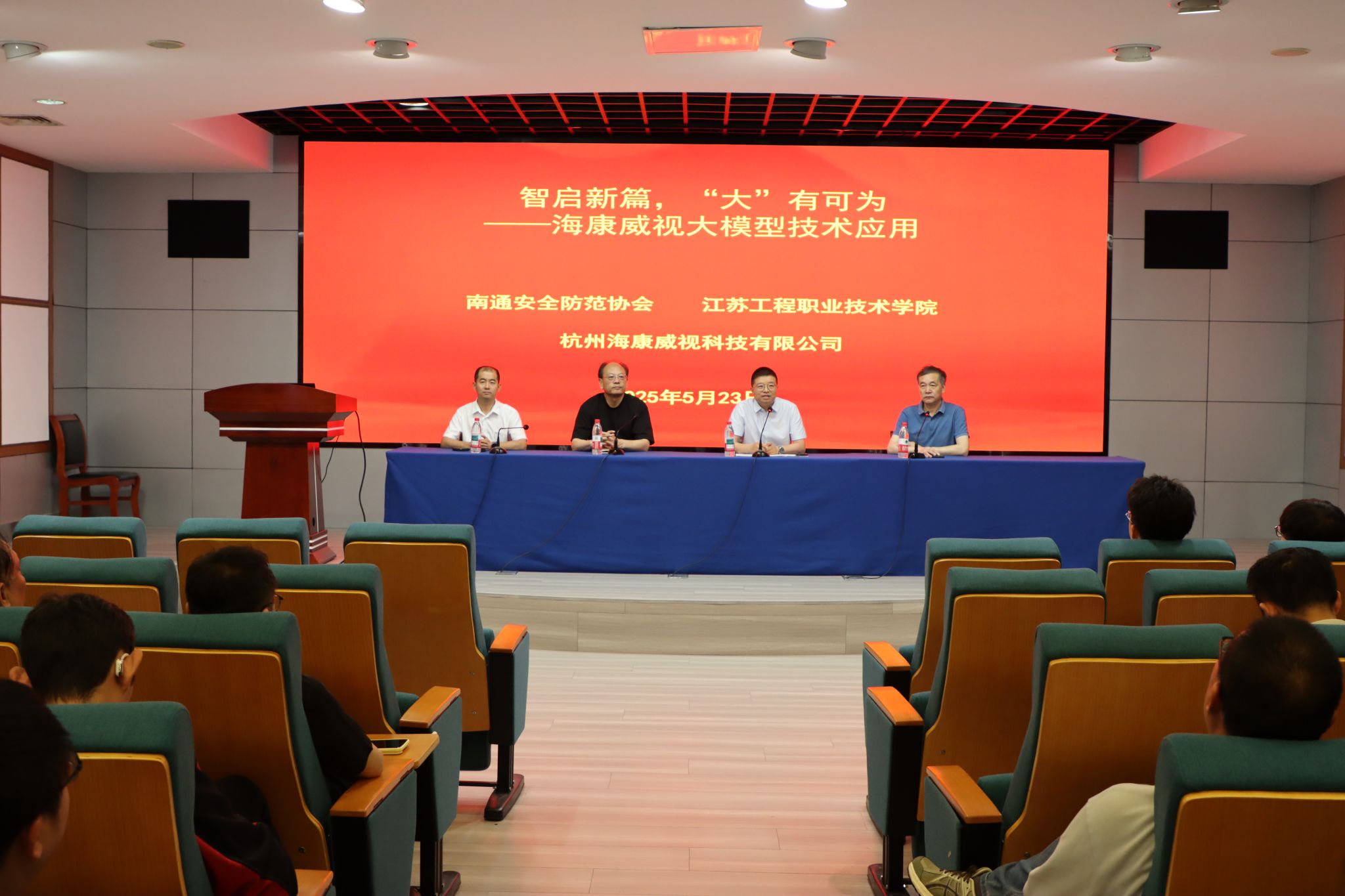 5月23日下午,我校在强毅楼十二楼演播厅举办了一场主题为“智启新篇,‘大’有可为——人工智能大模型技术应用”的技术培训。此次培训邀请海康威视江苏业务中心的专家主讲,会议吸引了南通安全防范协会会员单位的负责人、设计、采购及项目管理人员,以及我校建筑智能化专业教师和学生代表等100余人参加。建筑工程学院院长杨化奎出席并致辞。