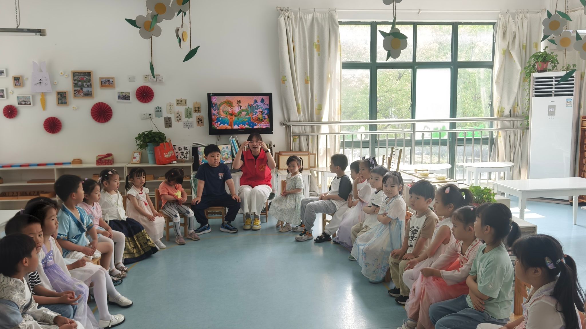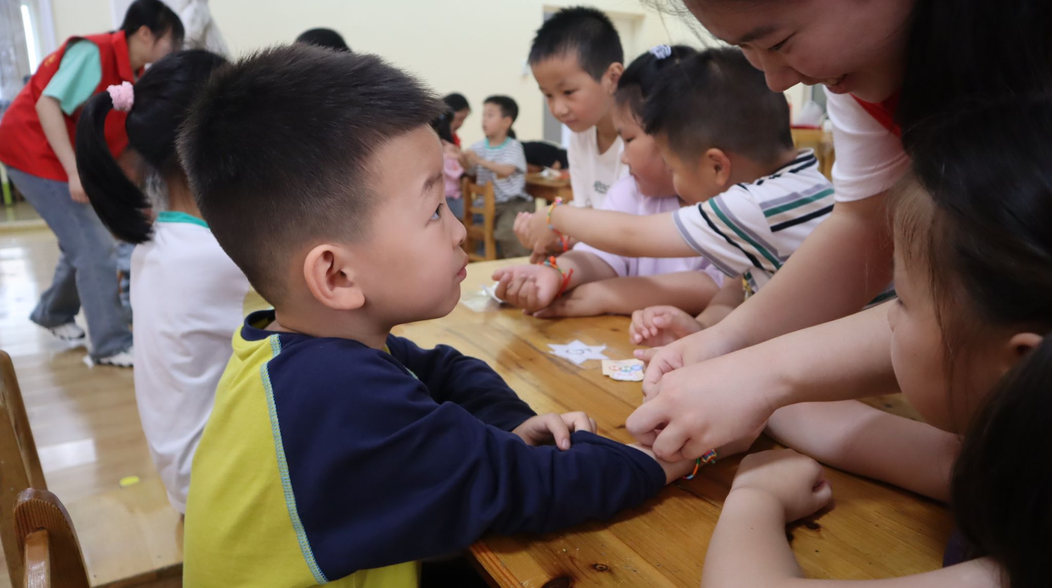 活动现场,志愿者借助生动的视频和互动问答,为小朋友们讲述端午节的历史渊源与文化内涵。在轻松愉快的氛围中,孩子们逐步从认知节日,到理解其深厚的文化价值,完成了一次传统文化的启蒙之旅。在手工实践与互动体验环节,孩子们在志愿者的悉心指导下,亲手制作五红绳和香囊,感受传统手工艺的魅力,体会“彩线轻缠红玉臂”中蕴含的美好祝福。随后,志愿者们带领孩子们跳起端午手势舞,孩子们用稚嫩的双手勾勒出艾草形状,在欢快的韵律中描绘出一幅鲜活的民俗画卷。童真的笑颜与传统文化的碰撞,不仅让千年民俗在孩子们心中生根发芽,更见证了文化传承的生生不息。