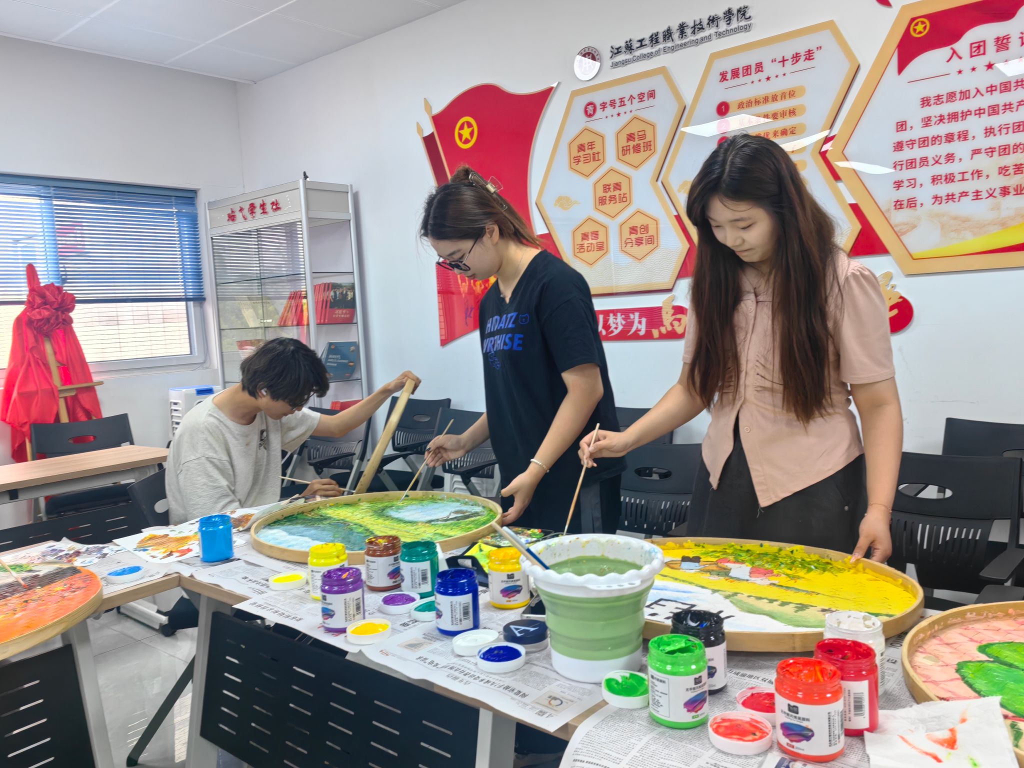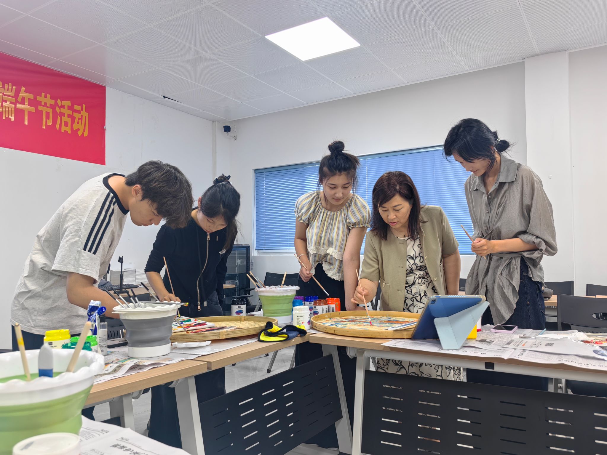 随后,同学们通过观看视频,系统学习了簸箕画的构图、色彩运用以及寓意表达等技法。自由创作与指导环节中,同学们热情高涨,分组投入到簸箕画创作中。有的同学参考传统农耕场景,以细腻笔触勾勒插秧、丰收画面,展现劳动人民的辛勤与喜悦;有的聚焦现代生态农业,绘出智慧农田、绿色乡村的蓬勃生机;还有同学独具匠心,将农耕与端午节元素巧妙融合。画面里,有金黄麦田旁村民包粽子的欢乐场景,粽叶飘香;有龙舟在水面飞驰,划船手奋力拼搏,岸边观众呐喊助威,尽显端午民俗活力,展现出传统文化与节日、农耕文化的交融之美。创作过程中,指导老师穿梭其间,为同学们提供专业建议,帮助大家不断完善作品。