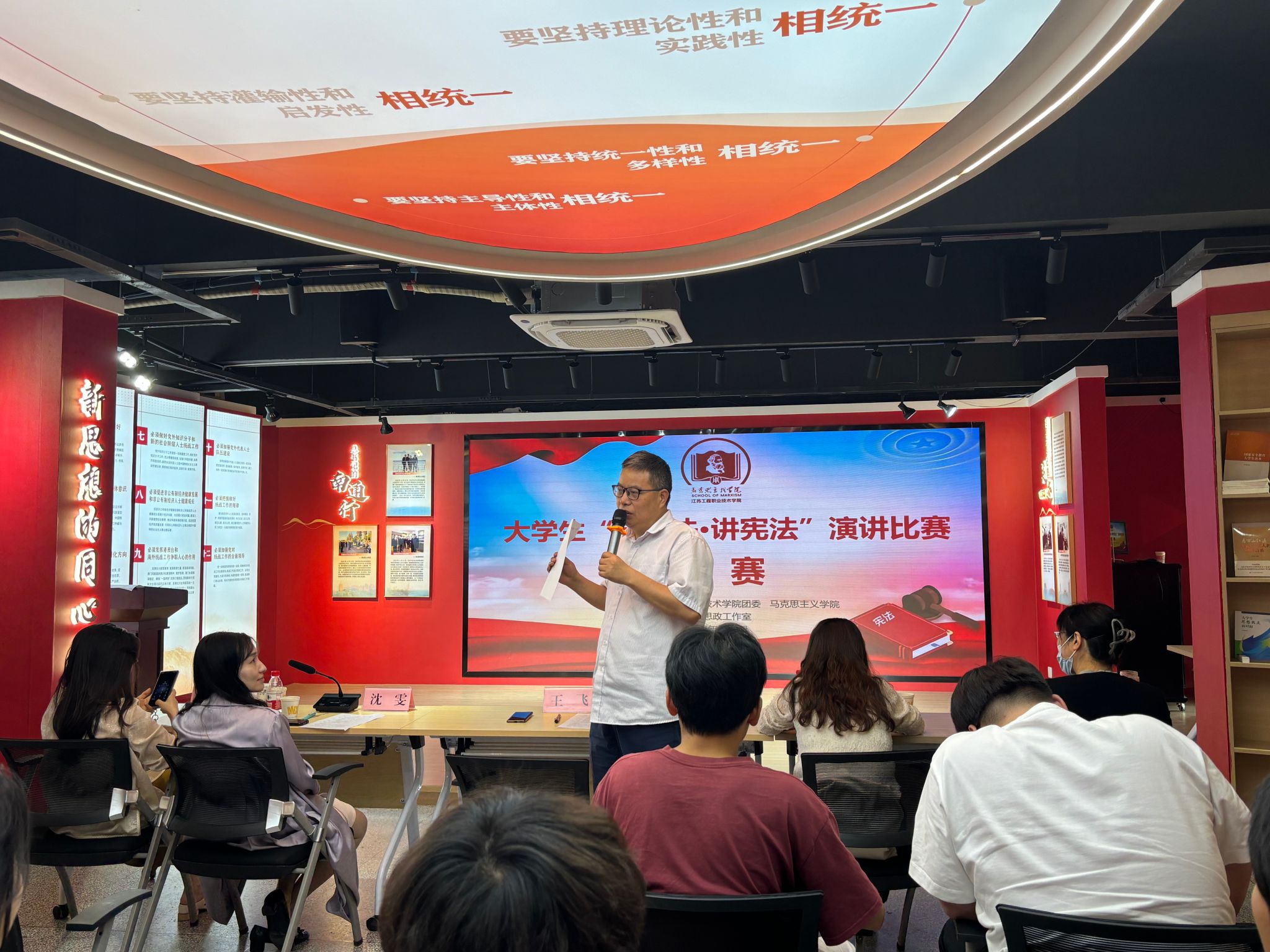 我校马克思主义学院王飞教授在点评中指出,参赛选手紧扣主题、案例翔实,展现了扎实的宪法素养。他建议选手们今后可以在演讲技巧和文本内容方面继续深化,使观点论证更具说服力和学理性。他希望同学们持续提升综合素养,在法治实践中更好地展现青年学子的风采。