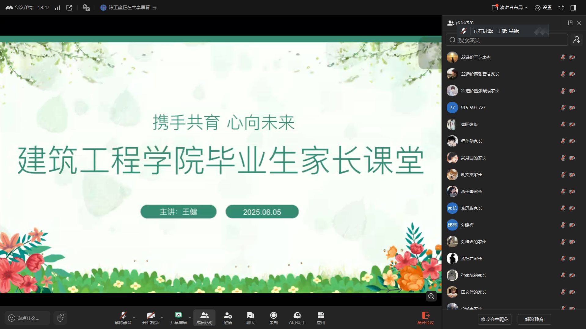 为构建家校协同育人机制,帮助毕业生家长科学应对学生就业关键期,建筑工程学院于6月5日特邀学校心理教育咨询中心主任王健开展“助力学生启航,拥抱多元成功”为主题的家长课堂活动。学院党总支副书记吴颖、心理辅导员杜秦与80余名毕业生家长共同参与。