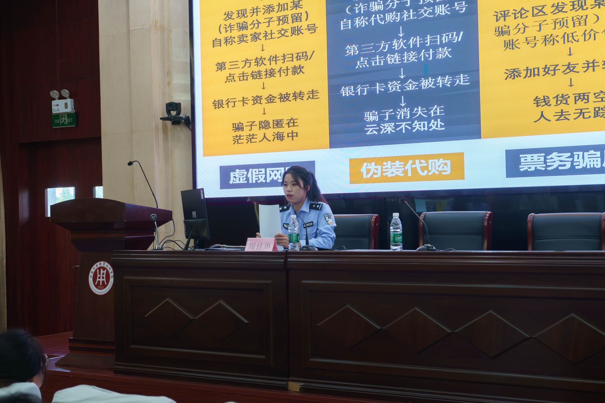 培训会上,周佳琳凭借丰富的实战经验和专业知识,围绕近期校园电信网络诈骗的发案态势,深入剖析了刷单返利、网络购物、冒充熟人、游戏交易、网络贷款等大学生群体中高发的诈骗套路。周警官通过还原真实且触目惊心的案例,生动揭示了诈骗分子的作案手法、话术技巧和心理诱导策略。