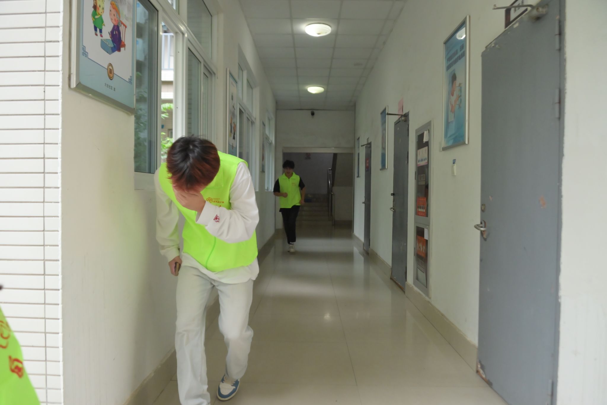 随着模拟起火点内5号宿舍楼202室“配电箱起火”警报的响起,消防安全系列教育活动进入到了安全逃生演练实战环节。内5号宿舍楼的学生们在自管会志愿者和消防员的指导下,用湿毛巾捂住口鼻,沿安全指示标识低姿撤离。与此同时,学田消防救援站的消防车鸣笛而至,消防员快速铺设水带,架起水枪对模拟起火点实施“内外夹攻”的战术。整个过程快速高效,充分展现了学田消防中队的专业素养。