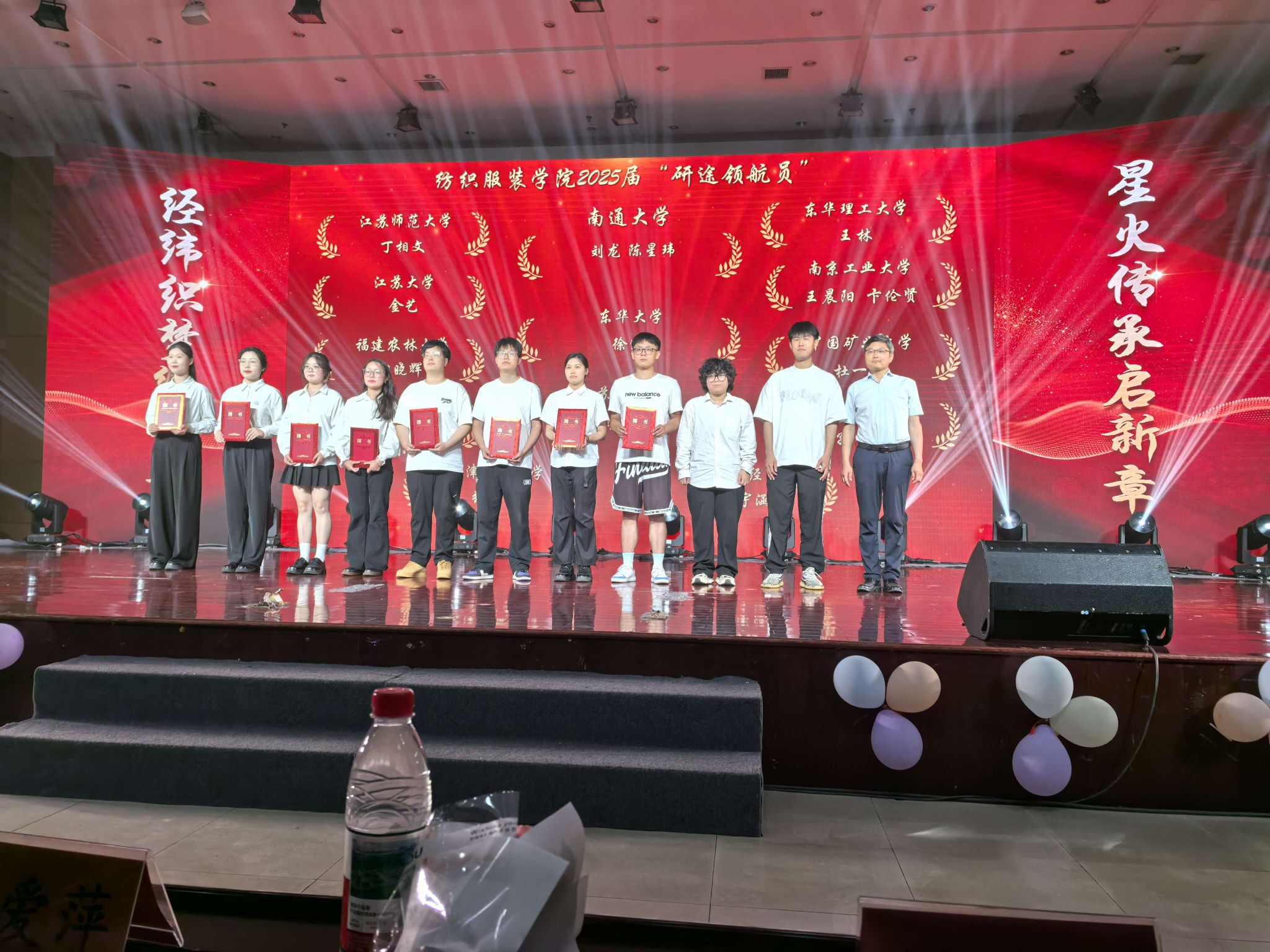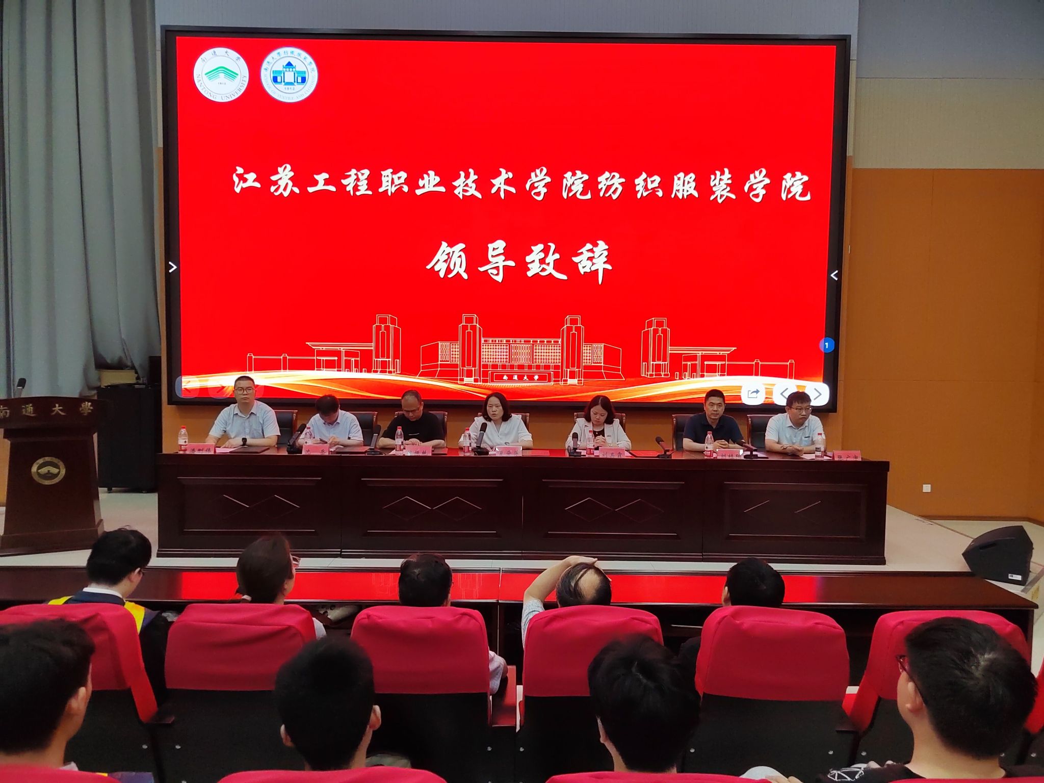 纺织服装学院党总支书记夏爱萍代表学院致辞。她回顾了同学们在两校联合培养期间的成长历程,肯定了大家在专业学习、实践创新等方面取得的成绩,希望同学们为纺织大国到纺织强国作出自己的贡献,在纺织行业领域勇攀高峰,以扎实的专业本领回馈社会。南通大学纺织服装学院党委书记刘其霞在讲话中表示,两校“5+0”联合培养项目是深化产教融合、协同育人的重要实践,同学们兼具两校的教育积淀,既要传承江苏工程职业技术学院的务实作风,也要发扬南通大学的学术精神,在未来的职业道路上坚守匠心、追求卓越,为纺织产业的创新发展贡献力量。23纺工二班丁相文作为毕业生代表发言,分享了在两校学习期间的收获与感悟,感谢母校的培养与老师们的悉心指导,并表示将会永远铭记母校的恩情,以实际行动为母校争光。