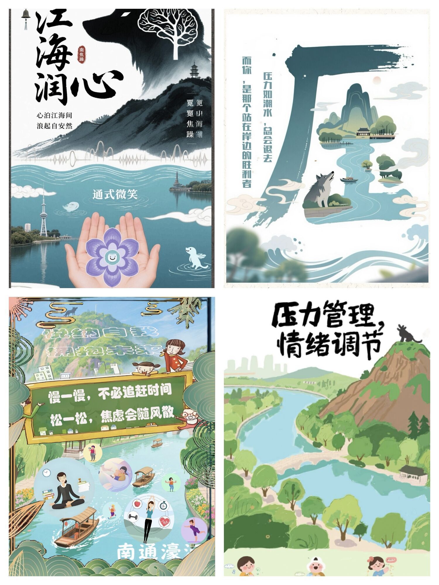 4月15日,在“江海润心”心理知识创意海报征集期间,建工学院学生融合南通濠河、狼山等元素,创作心理健康科普海报。建工心理站参赛有《江海心韵》《濠河呼吸协议》《向阳随风》《狼山科普河手抄报》《压力》等作品,竖版构图上,“水波舒展”寓意压力释放,“山雾消散”象征情绪明朗,配以原创心理箴言“心有岸则潮自安”,地域文化与心理知识完美融合,既拓宽了学生的认知边界,又在潜移默化中增强了他们的科普传播力。