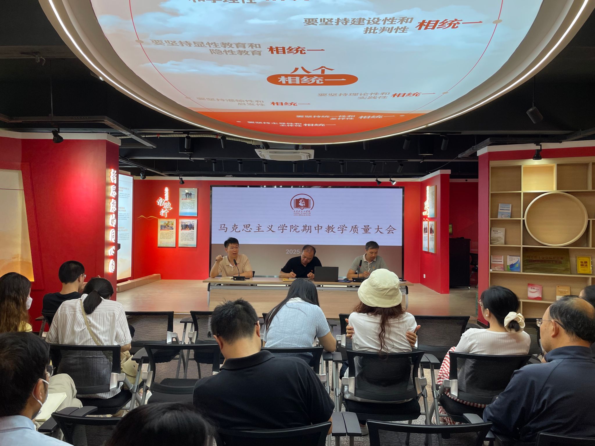 6月11日下午,马克思主义学院在新思想践悟馆召开本学期教学质量建设推进会,会议由学院副院长朱建主持,马克思主义学院全体教师参加。