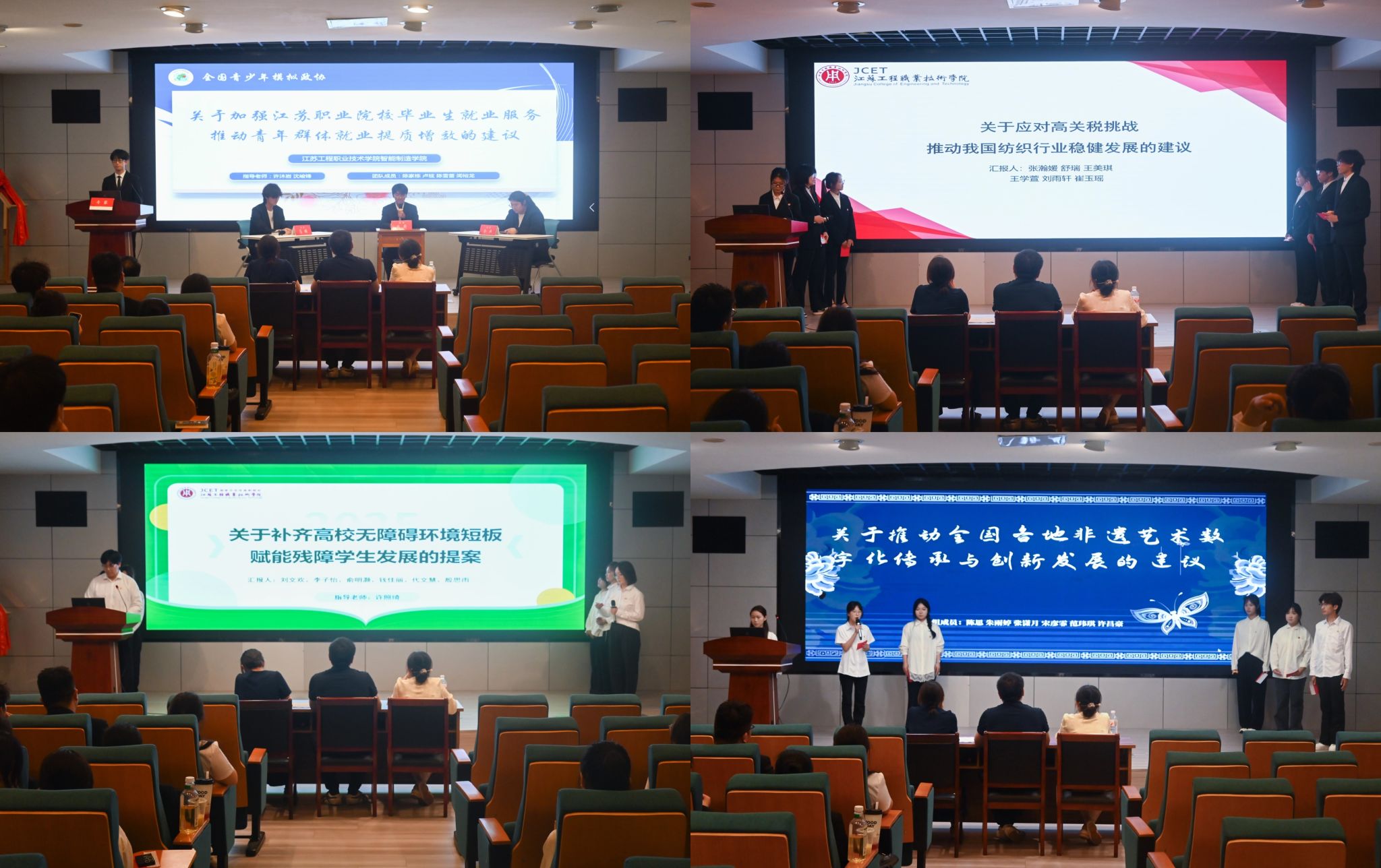 本次模拟政协提案评选活动自启动以来,在全校师生中反响热烈,共征集到32份提案作品。经专家评审,最终10支队伍入围校级展示选拔赛。在比赛现场,各参赛队化身“模拟政协委员”,聚焦国家发展和社会关切,将视野从“校园小课堂”拓展至“社会大课堂”,进行了精彩的提案陈述。经过紧张激烈的角逐,来自智能制造学院的“关于加强江苏职业院校毕业生就业服务推动青年群体就业提质增效的建议”提案获最佳提案奖和最佳展示奖,并推荐参加江苏省第三届职业院校学生模拟政协提案展示活动;23电气二班陈家栋获优秀风采个人,24新能源一班刘甜甜获最佳创意制作人,沈峻锋、许沐岩获得优秀指导教师。