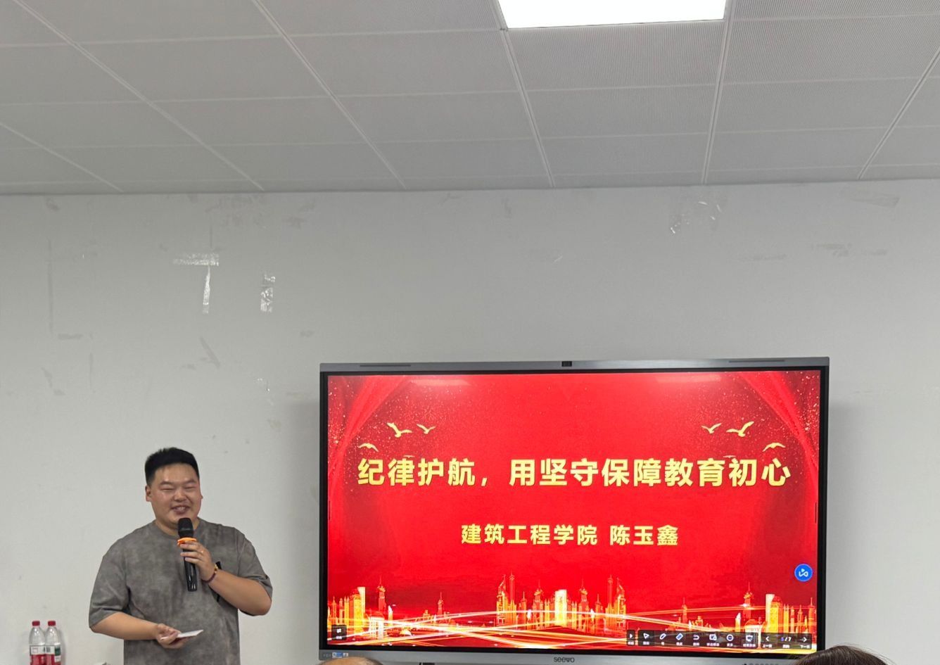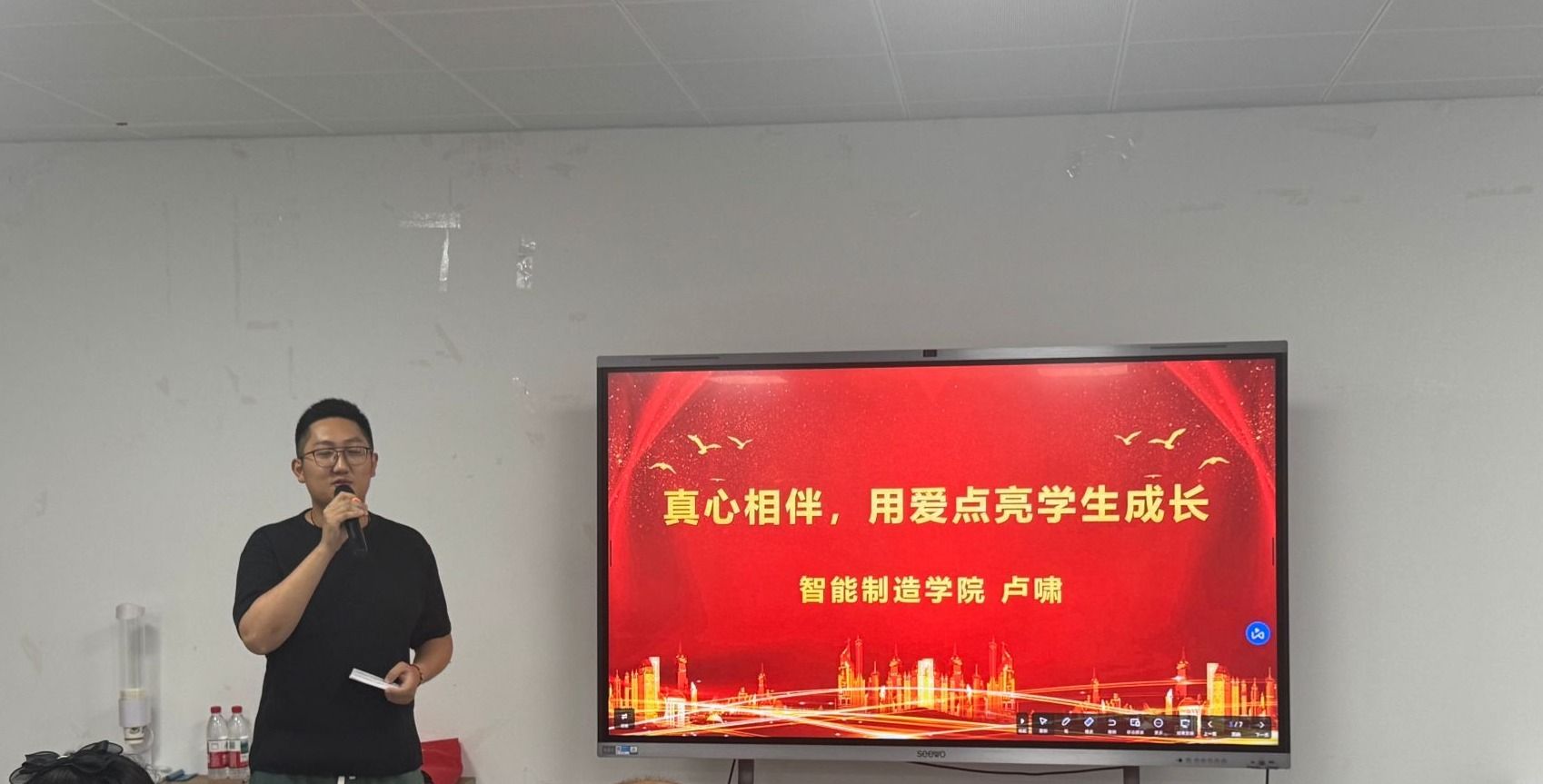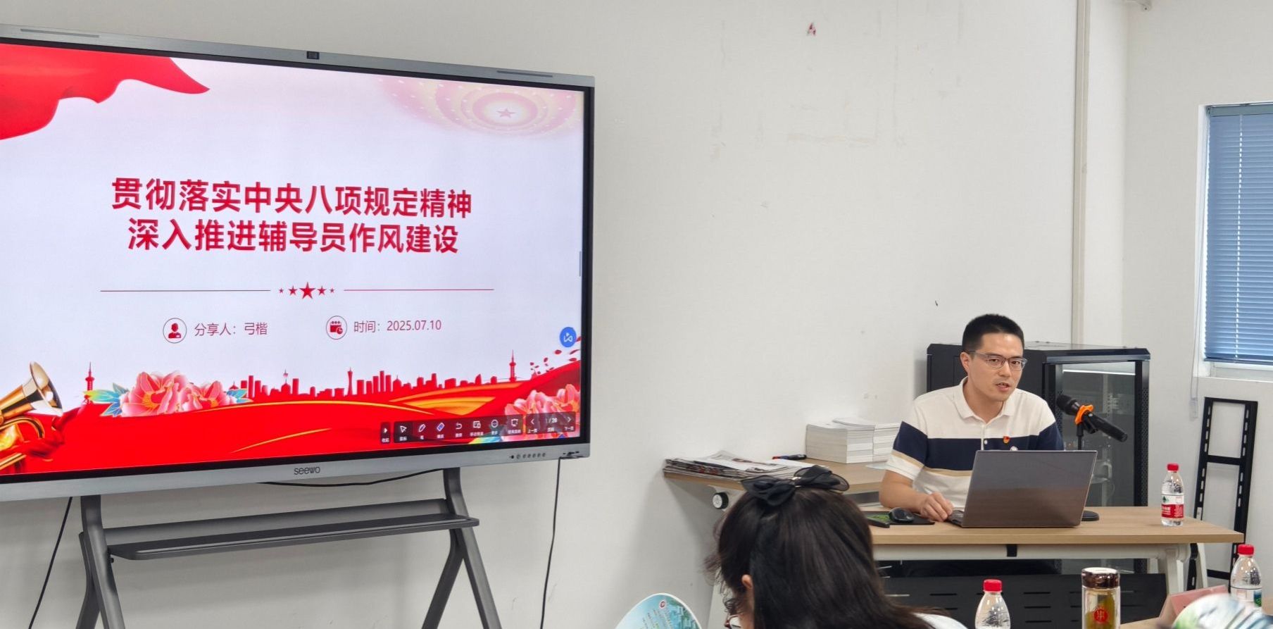 活动中,弓楷结合中央八项规定精神,阐释了辅导员作风建设的重要意义,并从锻造政治素质、提升业务能力、增强纪律意识三方面强调作风建设是落实立德树人根本任务的必然要求。随后,三位辅导员围绕理论解读与实践分享展开交流。卢啸讲述了帮扶特殊学生的暖心故事,诠释了“真心”在育人中的温度与力量;陶茜茜以一起宿舍矛盾引发的学生心理危机为例,展现了规则意识如何为育人工作筑牢根基;陈玉鑫分享了坚守海门校区学生工作一线、严守纪律准则的工作实践。
