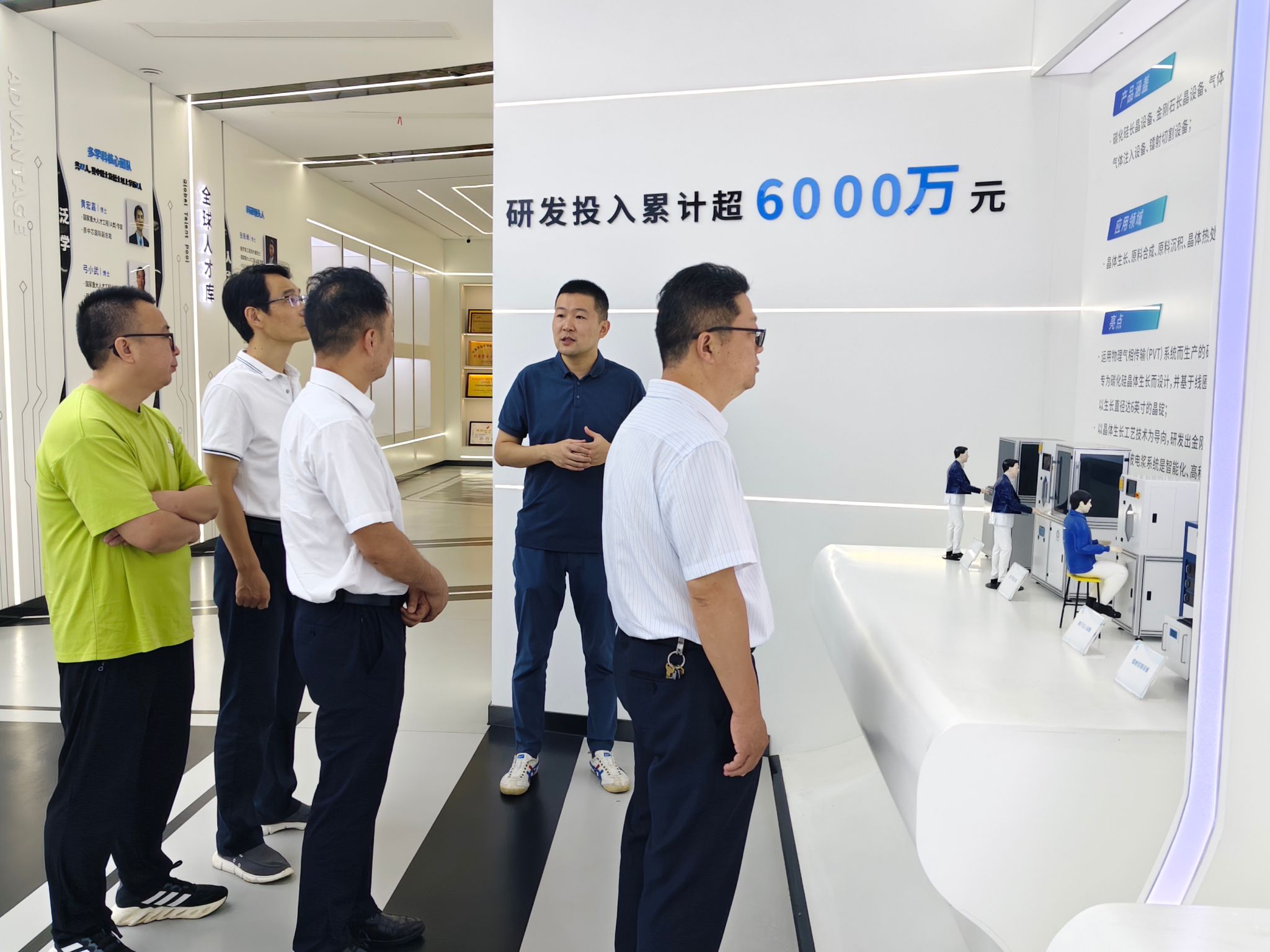 在江苏卓远半导体有限公司,调研团队参观了企业展厅与装备生产车间,了解企业在晶体装备及材料研发制造的成果与产业布局。作为一家专注于高新技术企业,卓远掌握SiC衬底材料制备与芯片设计核心技术,其金刚石CVD基片技术国内领先。参观过程中,校企双方围绕人才培养与岗位需求进行了深入交流,达成初步合作意向。