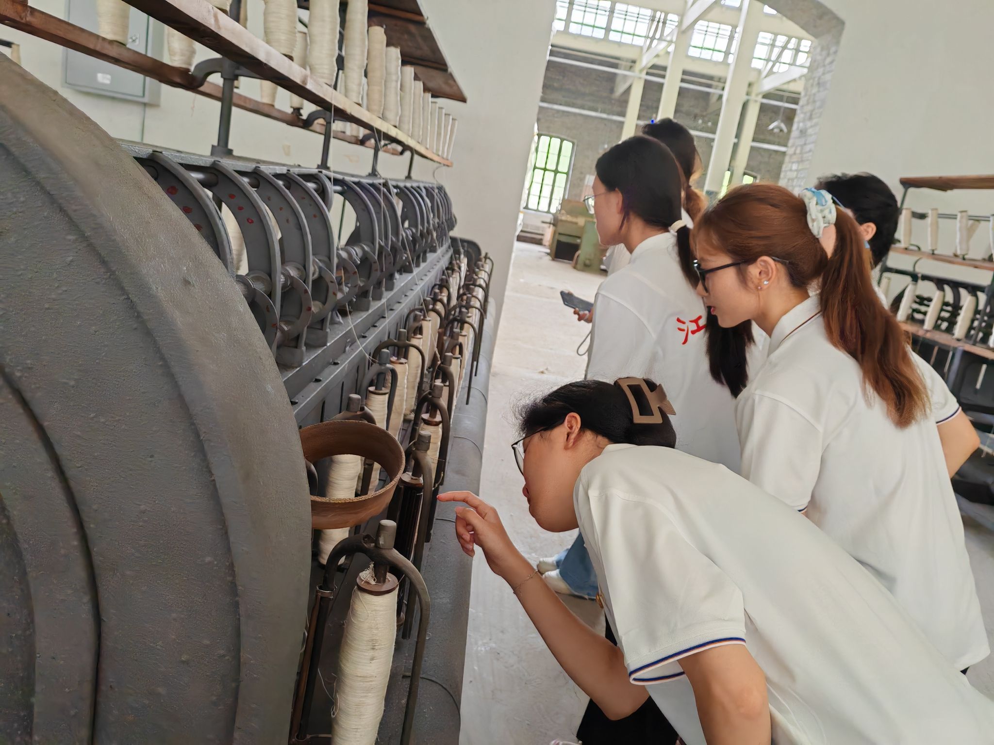 7月22日,实践团走进大成三厂织布车间旧址(现常州纺织博物馆)、大明纱厂旧址(现常州天虹纺织有限公司)等地,开启了一场穿越时空的红色工业之旅。在复原的历史车间里,展柜中褪色的照片和泛黄的档案默默陈列着,每一张影像、每一页纸片都在无声地讲述着那段“纱线救国”的烽火岁月;环锭细纱机与梳棉机等工业遗存静静矗立着,磨损的齿轮和锈迹斑斑的支架诉说着当年工人们前赴后继、夜以继日、战天斗地的爱国故事。当实践团成员们轻轻抚过这些饱经沧桑的机器时,大家触摸到的不仅是冰凉的金属,更是一代代纺织工人用生命铸就的热血丰碑。实践团成员冒宗妍感慨,这些机器会老化生锈,但是工人们“织布为战”的精神永不褪色。江苏省五一劳动奖章获得者、学院杰出校友韩梁,如今在常州天虹纺织有限公司担任总经理助理,她向同学们详细介绍了大明纱厂变革和发展的历程,她特别提到,从战时的旧机器生产到现在的智能化车间,变的只是生产方式,不变的是纺织人产业报国的初心,她勉励同学们要传承这份“经纬精神”,在新时代续写中国纺织业的辉煌篇章。