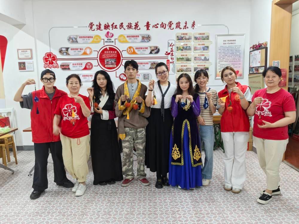 团队以专业服务为基石,让各民族幼苗在科学守护中茁壮成长。在东方幼儿园,团队成员引领孩子们跳起欢快的维吾尔族舞蹈,指导他们装点特色新疆小帽,并展示西藏传统的哈达礼仪。孩子们头戴自制小帽、手捧自制的红茶奶,在欢声笑语中悄然种下文化认同的种子。服务范围进一步扩展至“欣然童心”公益暑托班。志愿者们化身为“临时老师”,关工委的老同志陈蓉芳也亲临现场给予支持。“小心有‘诈’”主题活动通过动画和儿歌筑牢孩子们的安全防线;“尊老敬老”环节则讲述孝亲故事,传递深厚温情;“石榴非遗”活动通过非遗展示和手工体验点燃孩子们的参与热情,孩子们齐声朗诵“五十六个民族是一家”,生动诠释了“石榴籽精神”。在专业看护与悉心陪伴下,孩子们的暑假生活变得充实而温馨。
