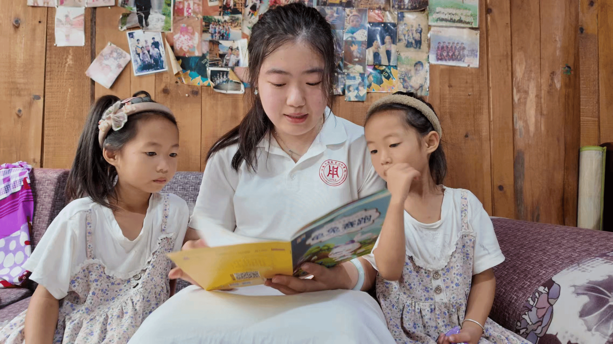 在小黄村的梯田上,实践团成员以欣欣然亲子俱乐部负责人周玉暄推荐绘本《慢石榴》开启了“梯田上的读书会”。成员们通过自主阅读、片段朗读、绘本句接力赛等形式,让孩子们在温馨互动中感受普通话的温度。侗族女孩吴芷萱捧着绘本感慨:“哥哥姐姐们陪我用普通话读故事,我觉得《慢石榴》和我们一样,成长是个漫长的过程,只要坚持就会成功。”阳光洒在梯田上,孩子们的朗朗读书声与风吹稻浪的声音交织在一起,成为最动人的语言课堂。在占里村的风雨桥中,实践团带来了侗族民间故事绘本《找金鸡》,让语言学习与文化传承深度融合。孩子们兴奋地对照绘本讲述自家银饰上的花纹、村口鼓楼的建筑特色,看到桥上的木雕花纹会主动用普通话描述:“这和绘本里鼓楼的雕花很像,都是龙和凤凰的图案!”活动最后,实践团将带来的绘本全部捐赠给当地儿童,团长隆思缘说:“普通话是乡村孩子看世界的‘望远镜’,当他们能用普通话讲好侗家故事,便是推普助振兴的意义所在。”