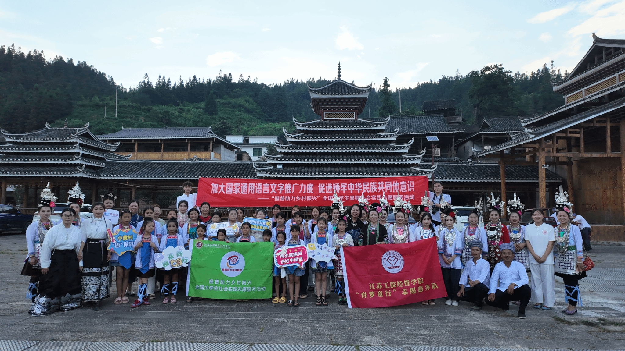 为深入推广国家通用语言文字,助力乡村文化振兴战略落地生根,8月8日至14日,我校“育梦童行”实践团联合崇川区民族团结进步促进会、欣欣然亲子俱乐部,奔赴贵州从江县小黄村、占里村及黎平县黄岗村,开展了一系列形式多样、内涵丰富的推普活动。从梯田读书会到风雨桥课堂,从非遗传承对话到红色足迹探寻,实践团以“推广普通话+文化互鉴”双线并行,为侗族同胞搭建起语言提升与文化交流的桥梁,让普通话成为乡村振兴的“金钥匙”。