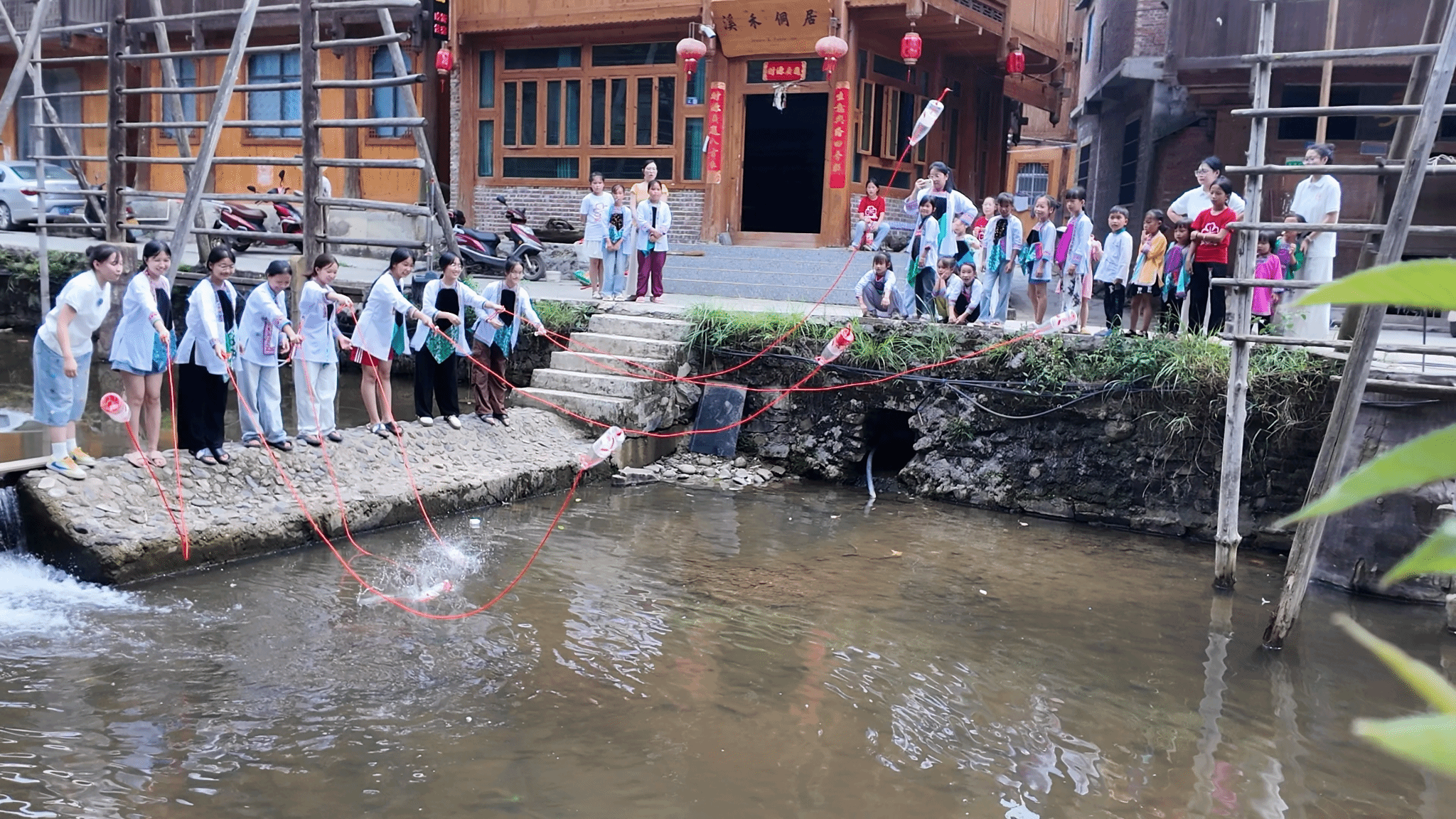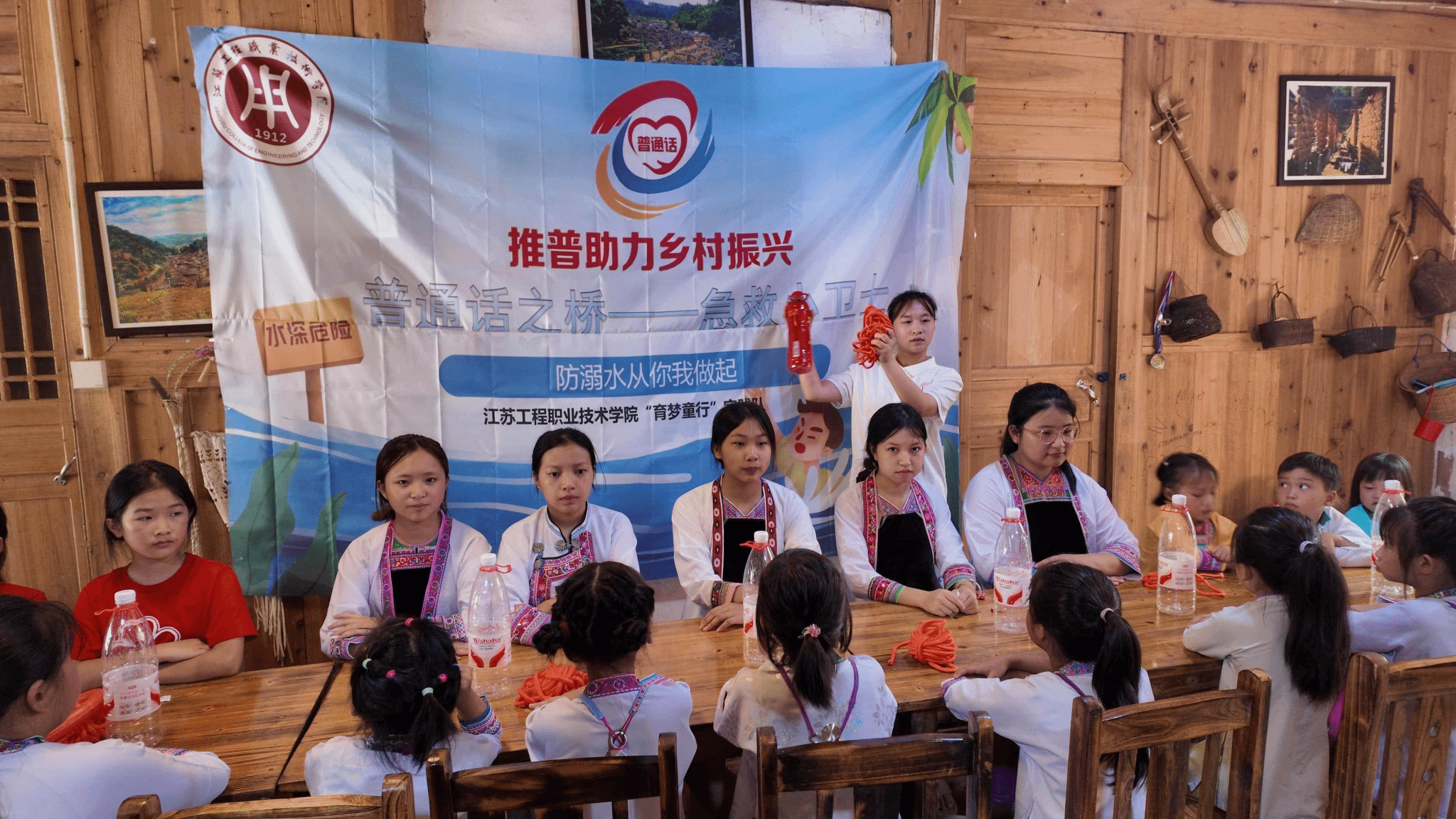 针对乡村儿童安全防护需求,实践团在占里村量身打造了“语言+安全”特色推普课程。成员们引导孩子们废物利用,用喝完的矿泉水瓶与救援绳制作简易救援包,在动手实践中培养环保意识。为让安全知识入脑入心,成员们结合当地语言环境,创编了朗朗上口的防溺水口诀,指导孩子们用普通话说出这些安全要点,遇到危险时才能清楚求助,并利用占里村的地理条件进行实操演练。孩子们分组扮演“落水者”和“救援者”,在成员的指导下练习用普通话沟通“距离太远,我需要帮忙”“请抓紧救援包”,反复练习判断距离、投掷救援包及配合拉绳等动作。侗族女孩吴如洁在演练后说:“我不仅学会了怎么救人,还知道‘救援’‘配合’这些词用普通话说,以后遇到事情就能说清楚了。”让语言学习与安全技能同步提升,让课程知识真正落到实处。
