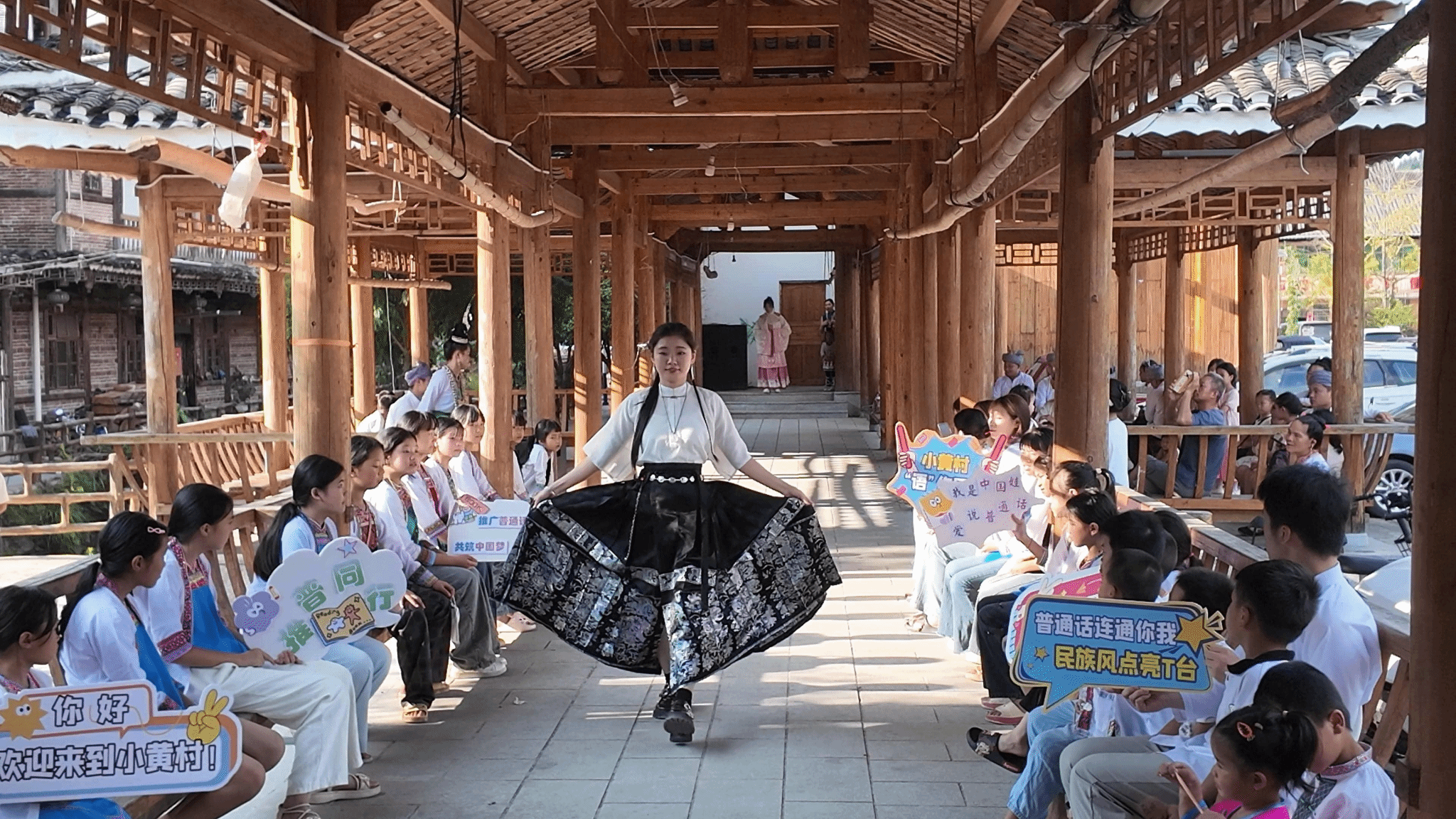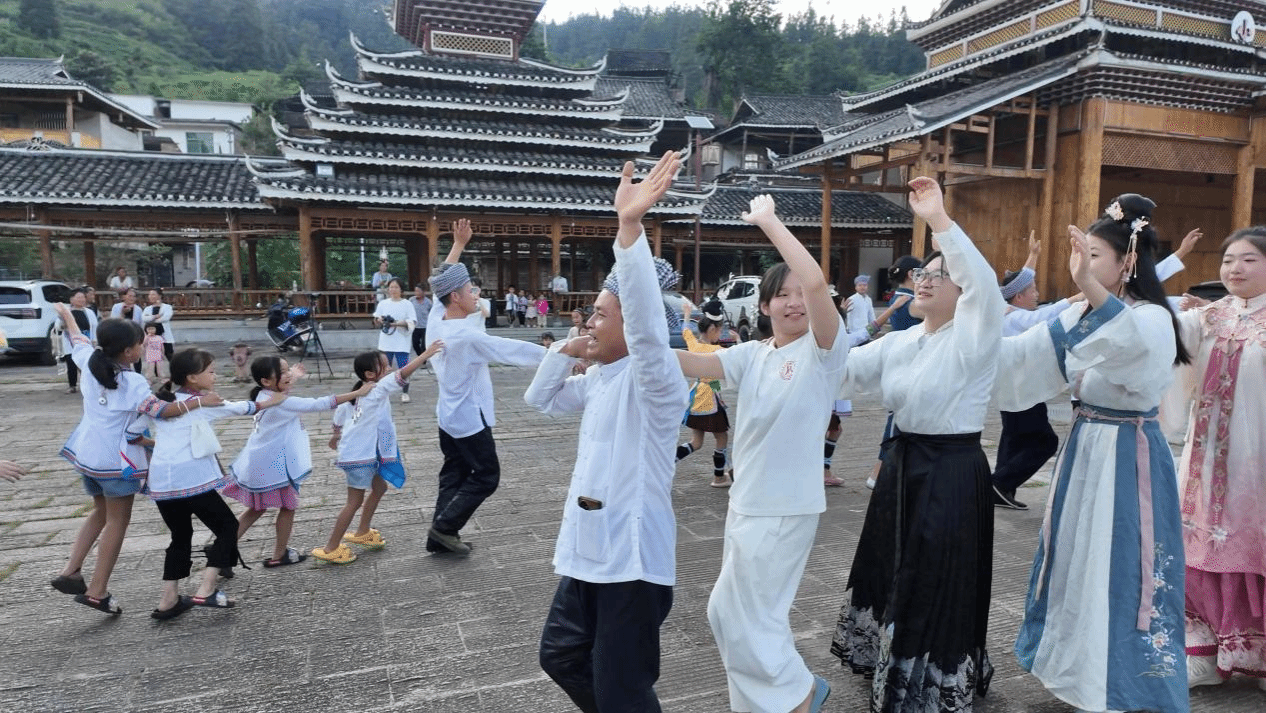 长桌宴上,实践团带来的南通味道与村民们准备的山的味道让人垂涎三尺。成员们将词语接龙、绕口令、美食发音袋等语言小游戏穿插其中,现场小朋友们在笑声中熟悉字词、纠正发音。西亭脆饼(xī tíng cuì bǐng)”“贵州山珍(guì zhōu shān zhēn)”的拼读声此起彼伏,让大家在品味佳肴时同步学习普通话表达。小黄村村民吴艳梅笑着说:“这次活动让孩子们尝到了南通味道,侗汉文化相融,让大家的心贴得更近了。”侗汉服装T秀环节,实践团成员化身为模特和服饰解说员,不仅身着素雅的蓝印花布服饰与身着斑斓侗族银饰盛装的村民们携手走秀,还将“单纯展示”升级为“文化解说+语言实践”的载体,让普通话成为服饰故事的“翻译官”。之后与当地侗族群众围成圆圈,伴随着《爱我中华》的歌声跳起多耶舞,舞步成为民族团结的纽带,让团结奋进的精神在每一个舞动的身影中熠熠生辉。