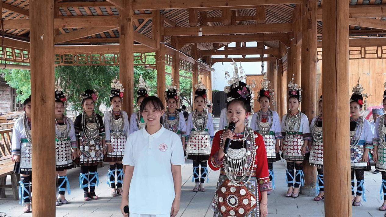 实践团的推普之旅,始于对侗族文化根脉的深度探寻。首站走进小黄村侗族大歌博物馆,在讲解员的细致讲解下,成员们了解了侗族大歌“众低独高”的复调音乐特色,以及歌词中蕴含的自然崇拜、生活智慧与民族历史,深刻认识到民族非遗文化与通用语言共生共荣的重要性——只有让更多人听懂侗族的歌声与故事,非遗文化才能真正“活起来”。随后,实践团专程专访了82岁的侗族大歌国家非遗传承人潘萨银花。老人用夹杂着方言的普通话缓缓讲述:“我们的歌声里有梯田、有鼓楼、有祖先的嘱托,要让更多人听懂,孩子们就得学好普通话,把家乡的美唱给全世界。”这番话让实践团成员深受触动,更明确了推普工作的文化意义。老人还兴致勃勃地教大家唱侗歌,成员们围坐成圈,跟着老人的节奏轻声学唱,在歌声中直观感受到侗族语言与音乐的独特魅力,也让推普工作的文化根基愈发坚实。