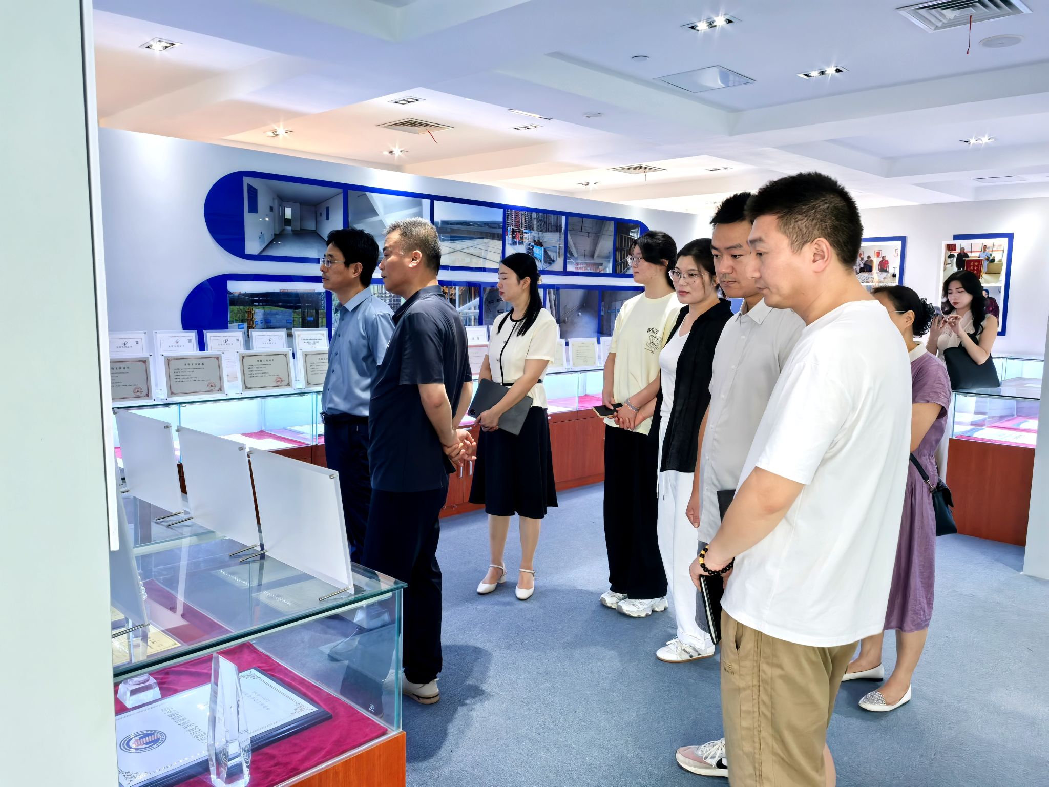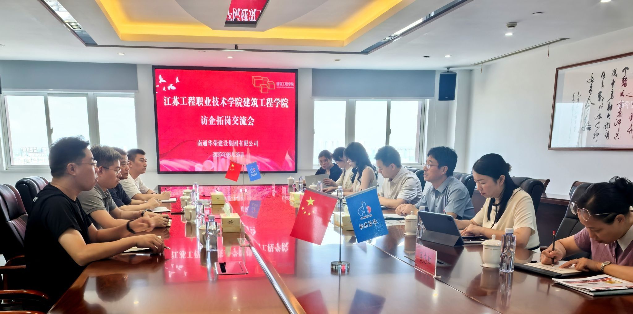 工作组携学生代表与家长代表走进南通华荣建设集团有限公司,将企业转化为“实景教学课堂”,打破校园与行业壁垒。南通华荣建设集团有限公司总经理陆峰等接待了我校一行。在企业陈列厅内,南通华荣建设集团副总经理崔建荣详细介绍企业项目组织架构、施工进度管理模式及核心岗位需求,用行业实例为学生和家长还原建筑工程领域工作场景。随后的座谈交流中,郭江峰介绍了学校的办学特色、专业建设成果及人才培养目标,提出在实习实训基地建设、博士进企业、订单式人才培养等方面深化合作的愿景。校企双方围绕建筑行业转型趋势、实践教学体系建设、企业定向人才储备等核心议题深入探讨,精准聚焦“企业需要什么样的人才”“学校如何培养适配行业需求的人才”两大关键问题,明确了协同育人的方向与路径。
