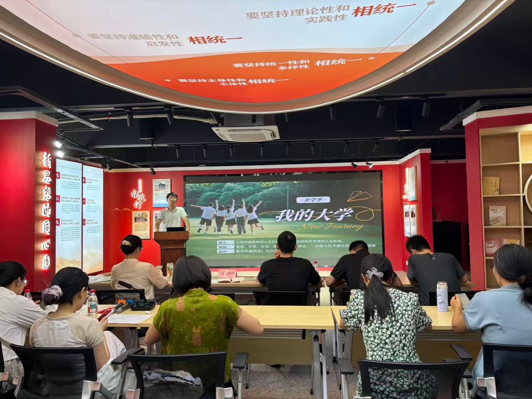 备课会聚焦“新生思政理论第一课”教学设计与实践,以“结对共育”为主题,引入辅导员与思政教师协同备课模式。教师们结合新学期教学目标,围绕“理论性、亲和力、针对性”为核心的课程优化设计方案,进行了充分交流。本学期初,辅导员孟诗凯与思政教师张甜甜、季晨、胡梦莉组成联合备课小组。孟诗凯在会上从辅导员视角提出“以学生日常行为规范为切入点,通过案例辨析引导守规意识内化”的建议,与教师团队共同开发课堂互动模块,实现思政课程与学生思政教育的有机衔接。