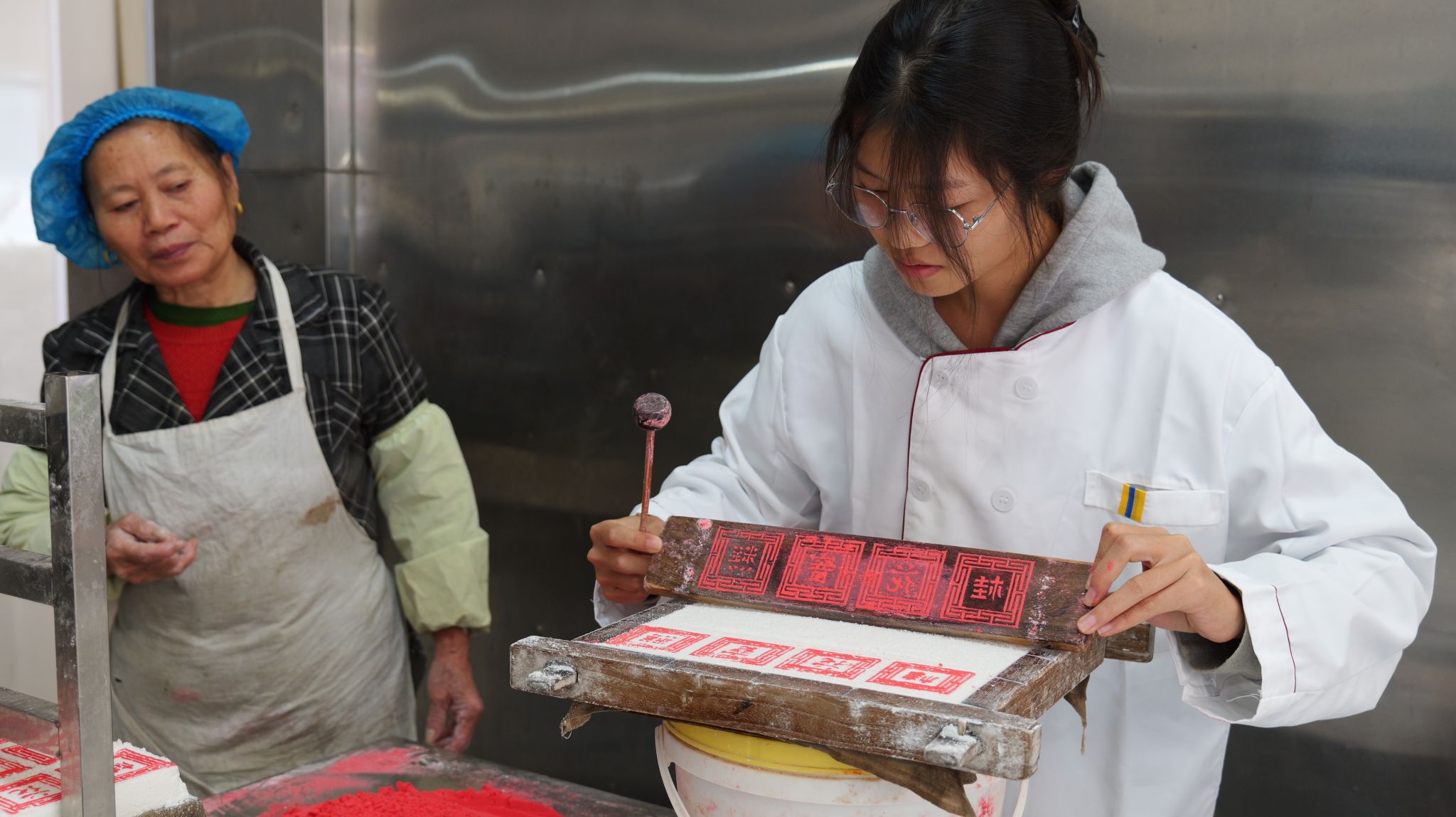 在石港窨糕非遗工坊,传承人张建华手持木模,向师生们展示窨糕制作技艺。从选料、浸米、磨粉到筛粉、压模、蒸制,每一道工序都蕴含着匠人的智慧。“窨糕的精髓在于三蒸三晾,既要保证口感软糯,又要让米香层层渗透。”张老师边操作边讲解,师生们围在操作台前,认真记录每个细节。在张老师手把手的指导下,大家尝试独立完成压模工序,当印有“福”“寿”字样的窨糕在蒸笼中渐渐成型,现场响起阵阵惊叹。