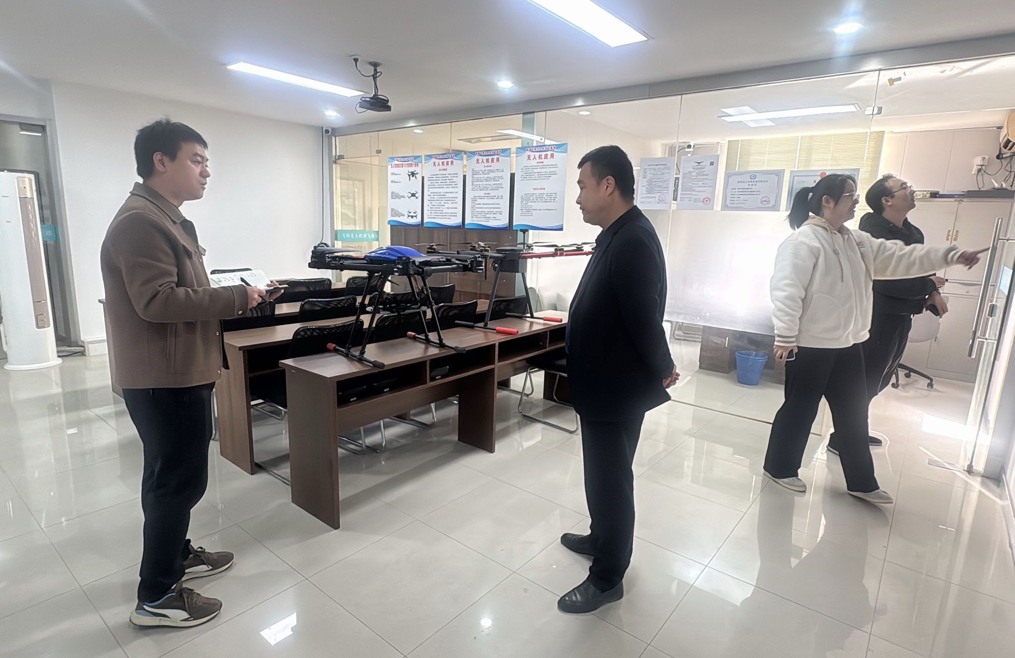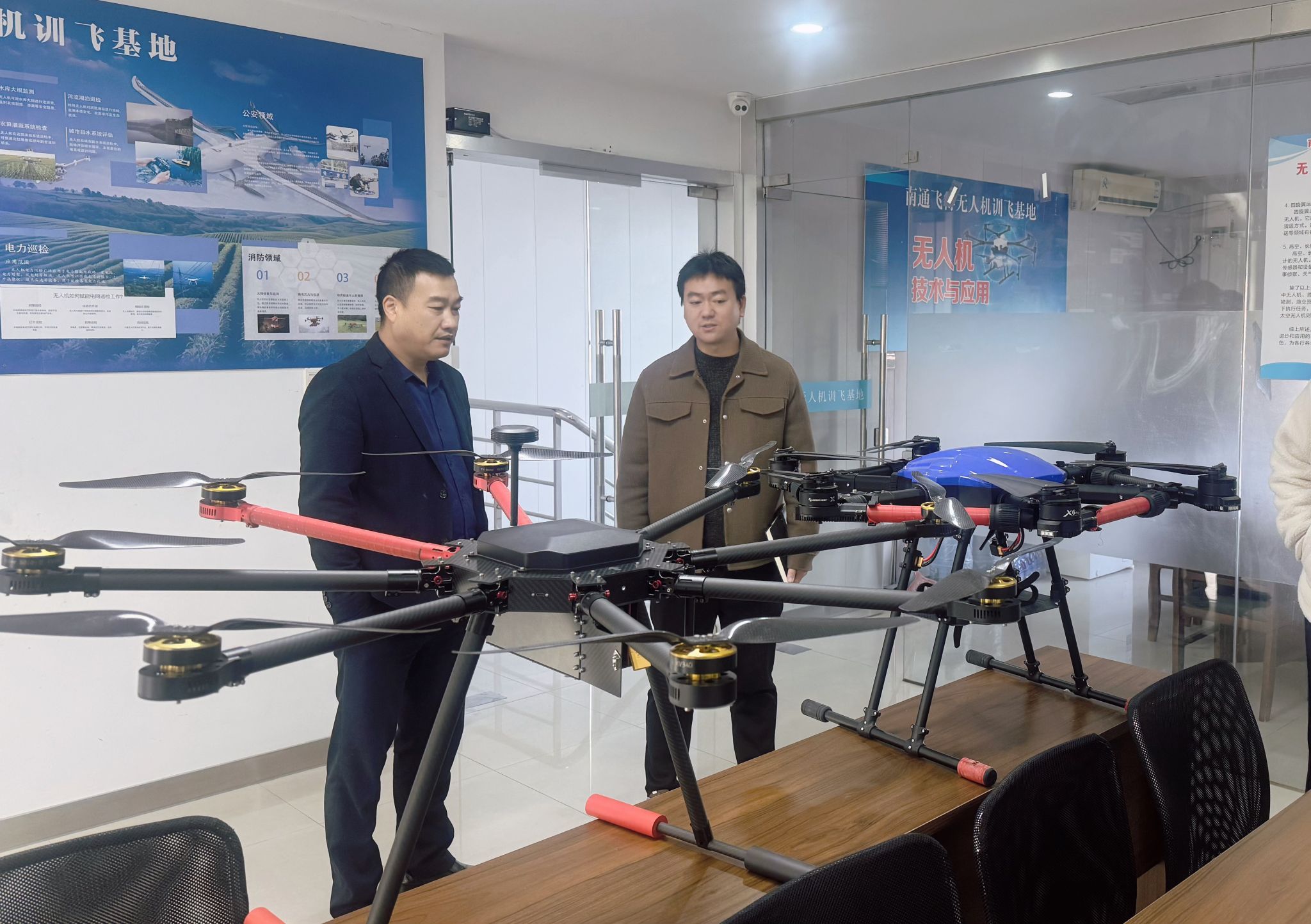 调研团队实地走访了基地的无人机实训展区,近距离了解多旋翼无人机的技术配置、作业性能,并通过基地展板与现场讲解,系统了解无人机在电力巡检、消防救援、农业植保等领域的工程应用场景。这些实际作业案例,与学院相关专业的实践教学需求形成高度契合,为后续课程内容拓展提供了行业参照。