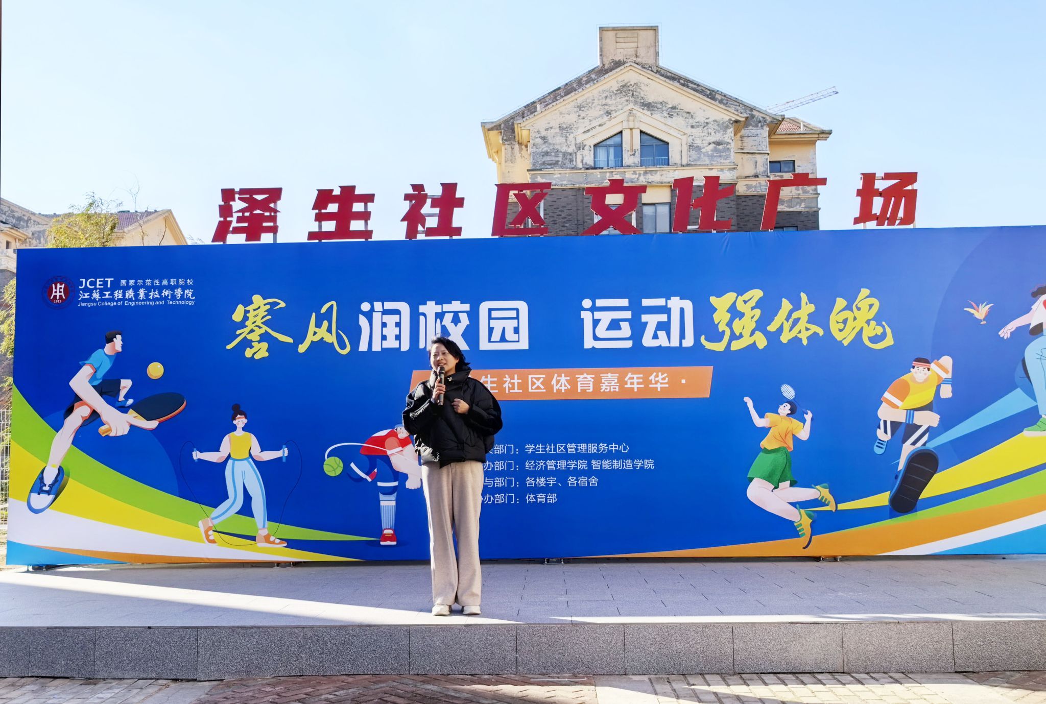 12月3日,“謇风润校园,运动强体魄”体育嘉年华活动在校泽生社区、颐生社区同步开展。本次活动由校学工处主办,经济管理学院、智能制造学院联合承办,校体育部协办。学生工作处处长夏爱萍、学生社区管理服务中心主任许晓月、社区中心主任陈芳芳、王琰以及辅导员代表与600余名社区学生齐聚一堂,共享运动盛会。