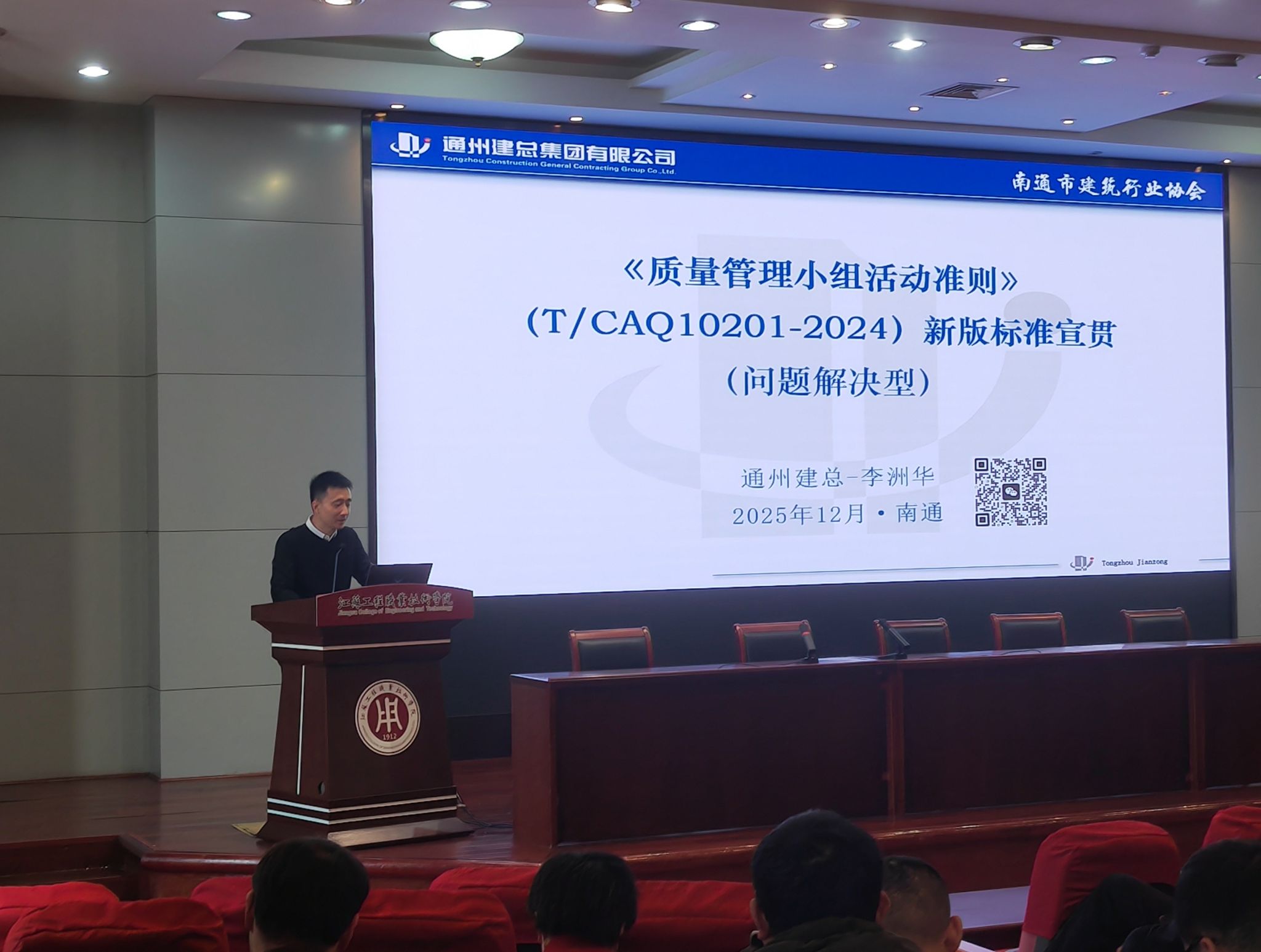 12月11日,由南通市建筑行业协会主办、我校承办的《质量管理小组活动准则》(T/CAQ10201-2024)专题宣贯培训在致知楼报告厅举行。南通市建筑行业协会会长沈卫星、秘书长高铭,继续教育学院院长姜生,建筑与交通工程学院院长王斯海出席活动,全市建筑施工企业总(副)工程师、项目经理、技术质量负责人及QC小组成员共220余人参加培训。培训由高铭主持,姜生致欢迎辞。