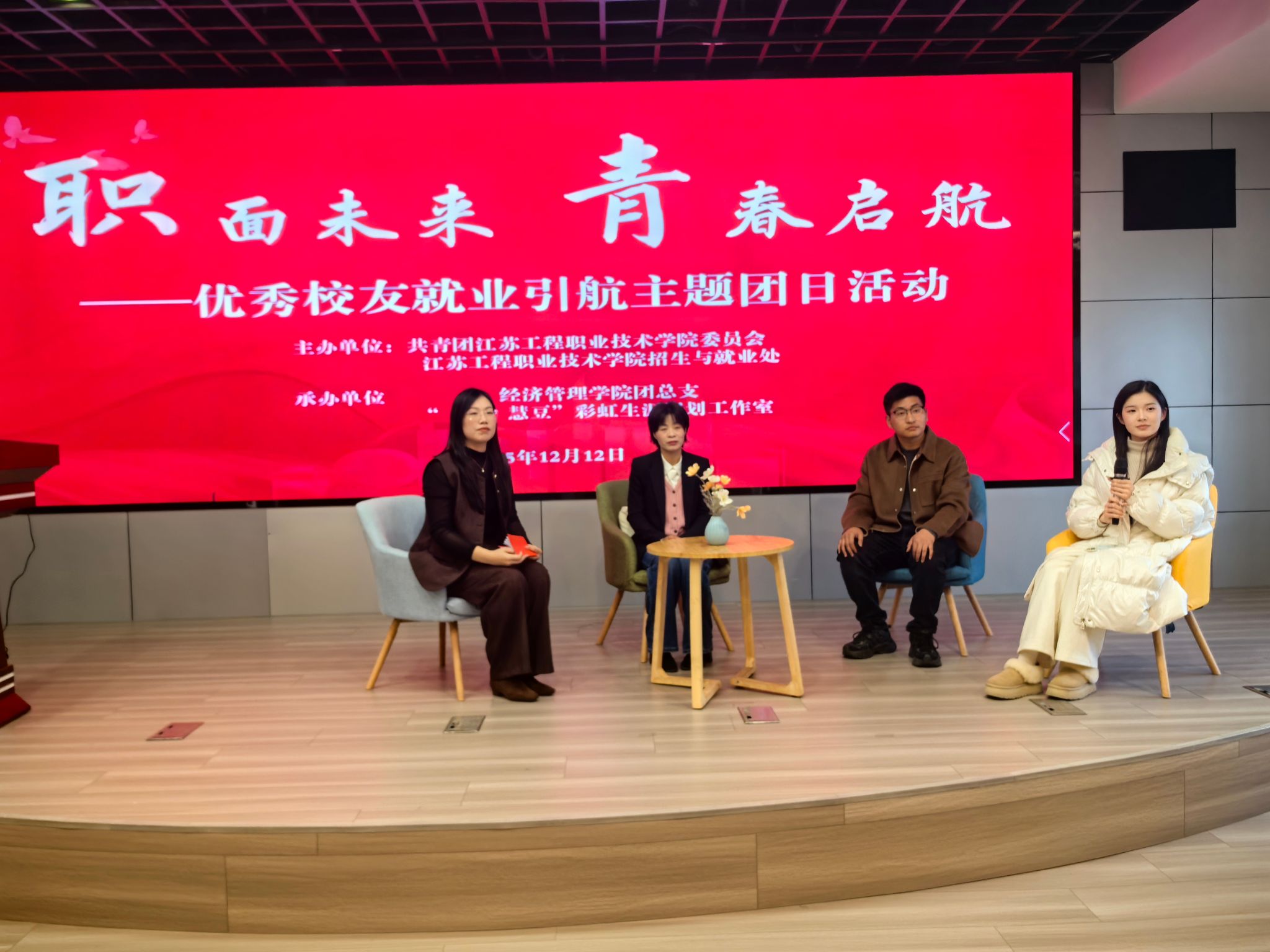 12月12日,由校团委、招生就业处主办,经济管理学院团总支、“‘职’慧豆”彩虹生涯规划工作室承办的“职面未来 青春启航”优秀校友就业引航主题团日活动暨梦想公开课在强毅楼12楼举行。活动邀请校团委副书记张禧嘉、学工处副处长张悦、招生就业处就业指导中心史蓓担任嘉宾,经济管理学院党总支副书记沈峻锋以及100多名学生代表参加了本次活动,活动由学院团总支副书记李慧娴主持。