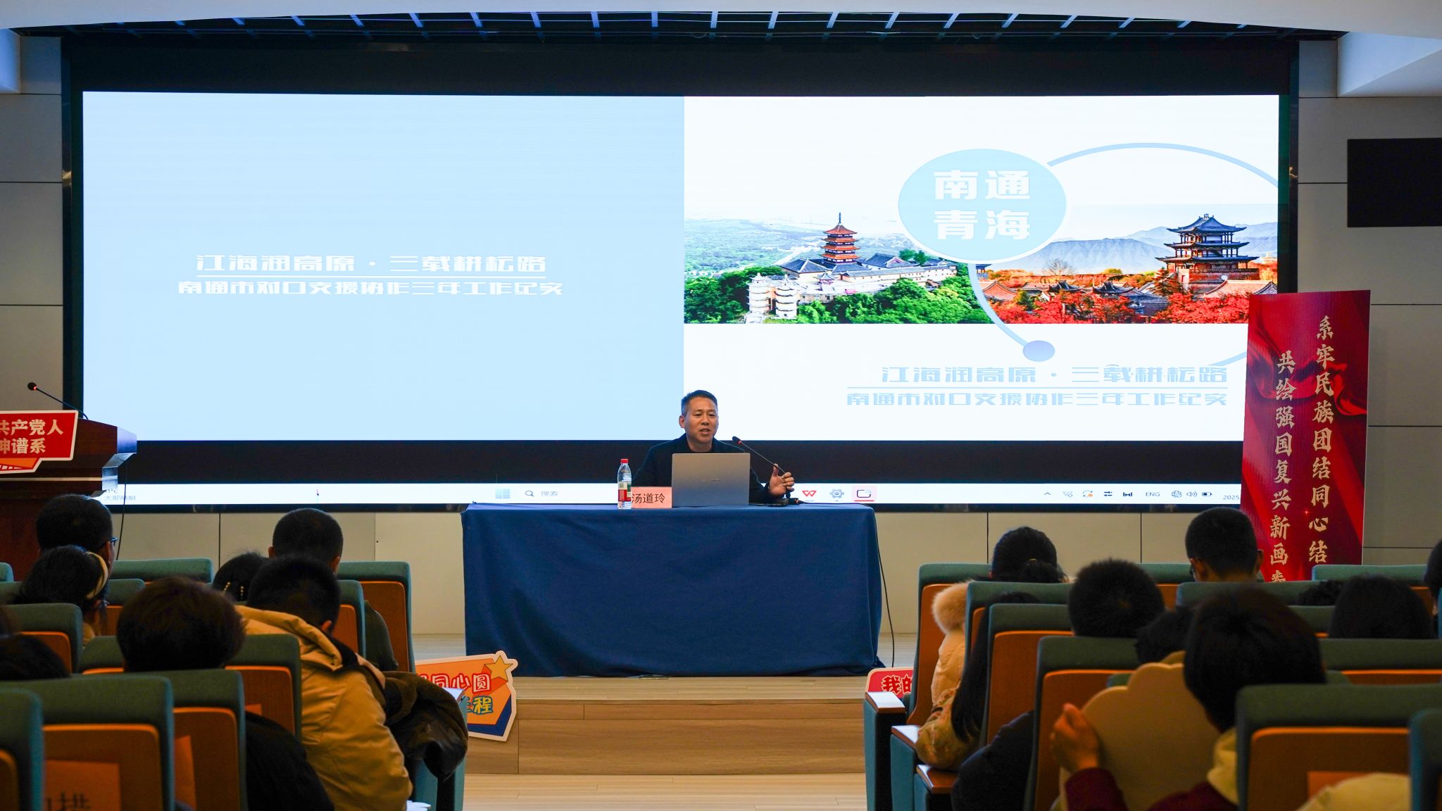 作为深化新时代统战工作、拓展思政育人格局的重要举措,本次活动特邀南通市农业农村局执法支队副支队长、贵德县农牧科技局挂职副局长汤道玲作专题报告。报告以“苏青奋进 共绘发展新篇章”为主题,立足南通对口支援贵德的生动实践,融合政策高度、理论深度与实践温度,系统阐释了东西部协作、各民族交往交流交融对于推动共同发展、促进民族团结的重大意义。汤道玲结合自身在支援合作一线的经历,分享了促进民族地区发展、服务青年成长成才的宝贵经验,为学院进一步做好民族团结教育与思想政治引领工作提供了重要借鉴。