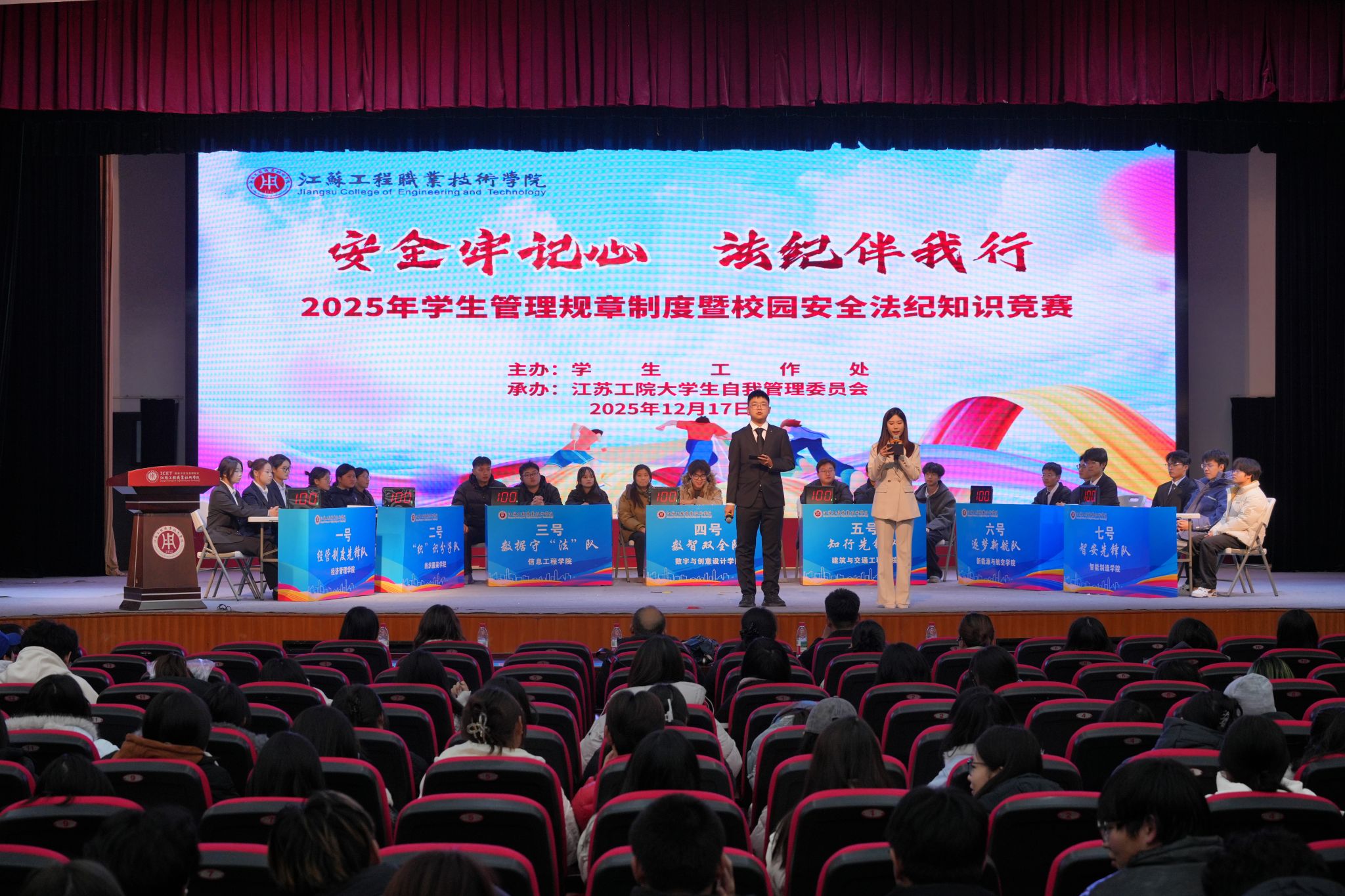 竞赛立足校园生活实际,围绕《江苏工程职业技术学院学生手册》(2025版)中的学生管理、学籍管理、评优评先、奖助学金、宿舍管理、违纪处分等各项规定,融入《“强化安全意识,共建文明校园”线上学习测试题库》重要知识点,全面、精准考查学生对校纪校规与安全知识的理解掌握程度。比赛现场气氛热烈而有序,选手们沉着应对、踊跃竞答,充分展现了扎实的知识功底、敏锐的反应能力和积极向上的精神风貌。经过紧张激烈的必答题、抢答题和风险题三轮角逐,新能源与航空学院代表队荣获一等奖;智能制造学院、经济管理学院获二等奖;纺织服装学院、建筑与交通工程学院、信息工程学院、数字与创意设计学院代表队分获三等奖。