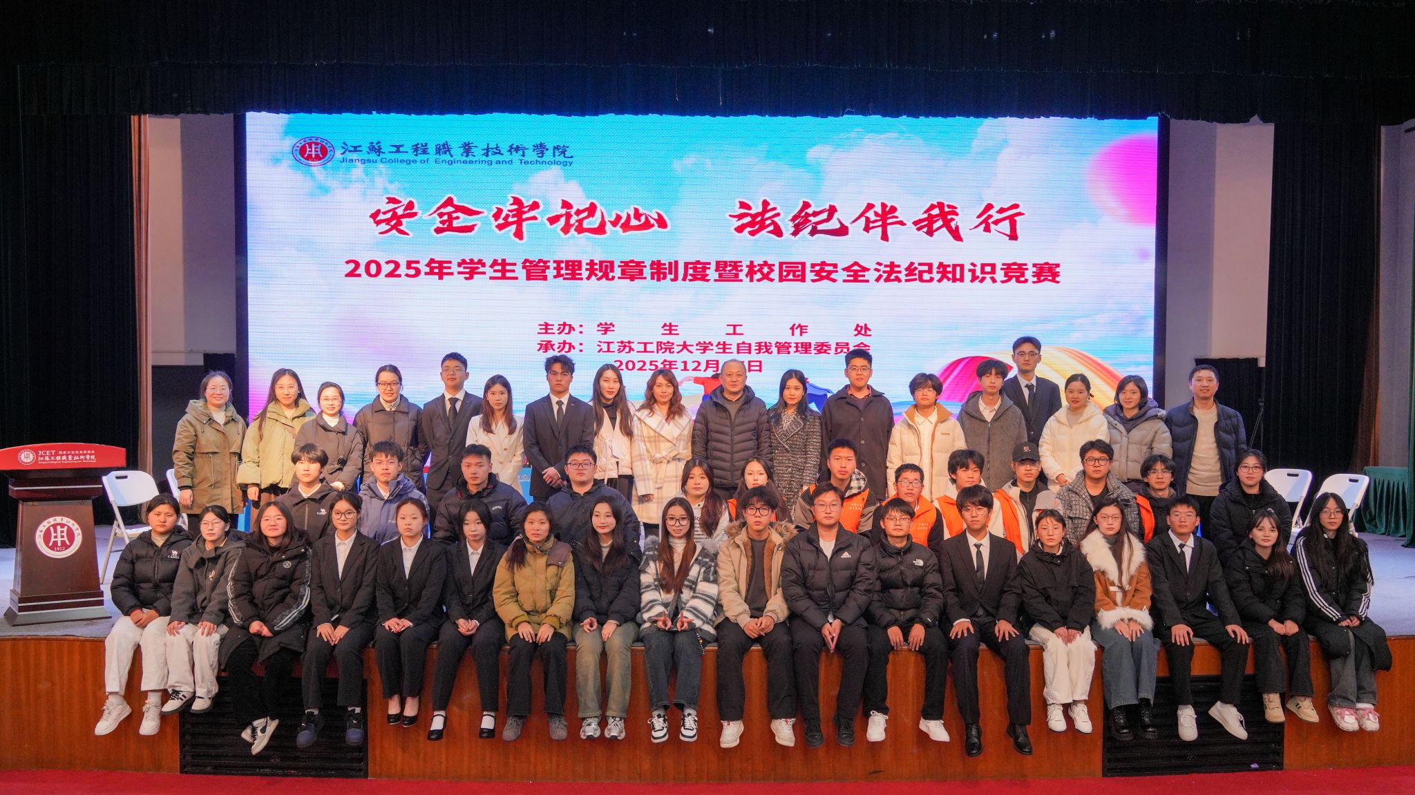 为强化学生法纪安全意识,提升自我管理能力,12月17日,以“安全牢记心 法纪伴我行”为主题的2025年学生管理规章制度暨校园安全法纪知识竞赛在崇川校区大礼堂成功举行。活动由学工处主办、校学生自我管理委员会承办,特邀校安全保卫处处长徐明、团委副书记张禧嘉、学工处副处长张悦、法治办公室李荆树老师担任评委。各二级学院学生工作副书记、辅导员班主任代表及600余名学生现场观摩。