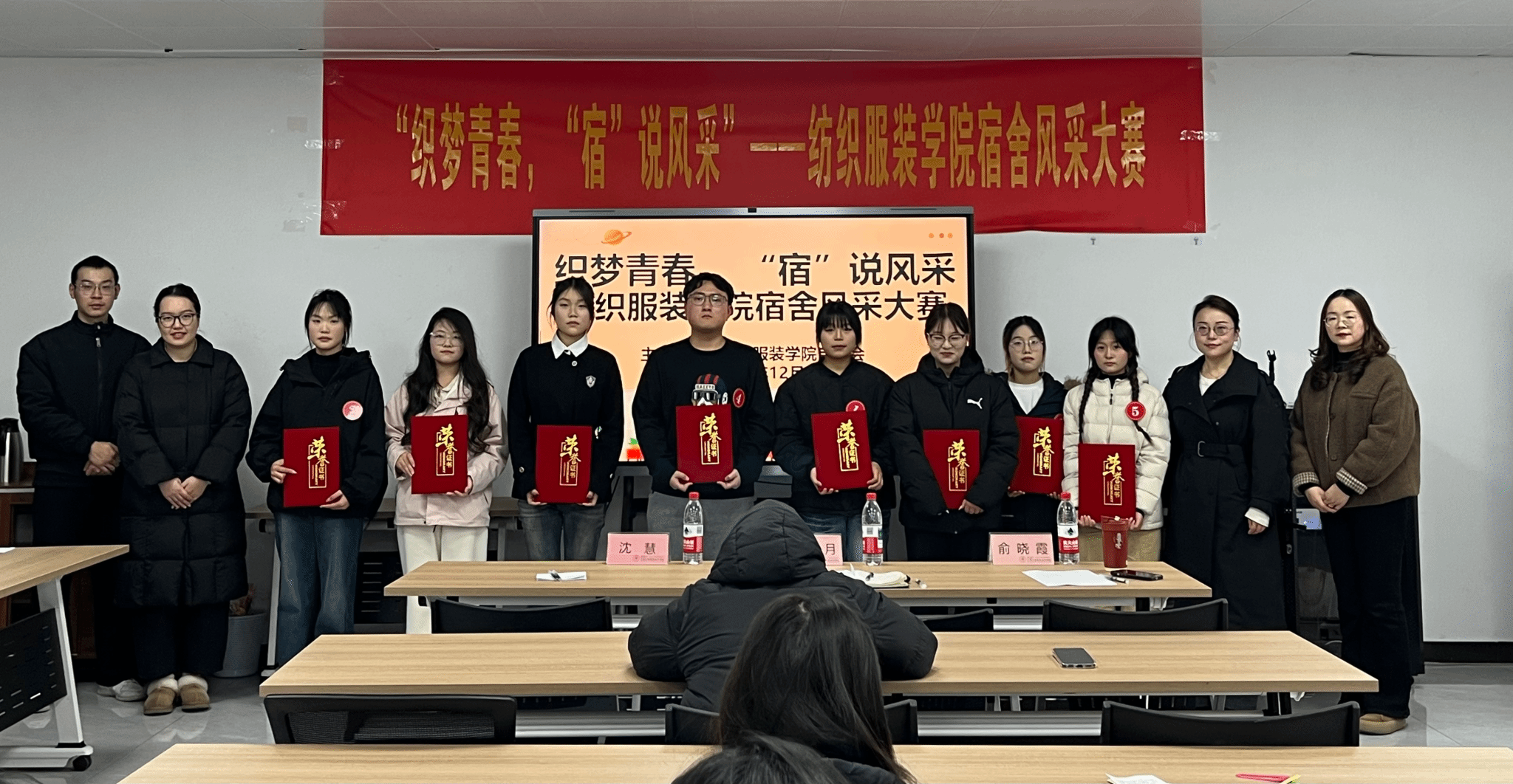 经过前期选拔,共有8间优秀宿舍脱颖而出,入围本次决赛。比赛现场,各宿舍代表依次上台,通过精心准备的PPT与个人讲述,全方位展示了各自宿舍的独特风貌。内容涵盖舍友个性介绍、集体生活习惯、多元兴趣爱好、常态化卫生维护以及牢固的安全意识等多个方面。一个个生动有趣的宿舍故事、一张张温馨友爱的合影、一份份共同制定的宿舍公约,不仅展现了纺服学子们整洁有序的生活环境,更体现了他们团结互助、共同成长的真挚情谊与积极向上的精神面貌。最终内9-607宿舍获得一等奖,内2-405-1、外8-330、内5-414等三间宿舍获得二等奖,内2-204-1、内5-601、内2-501-2、内2-103-2获得三等奖。