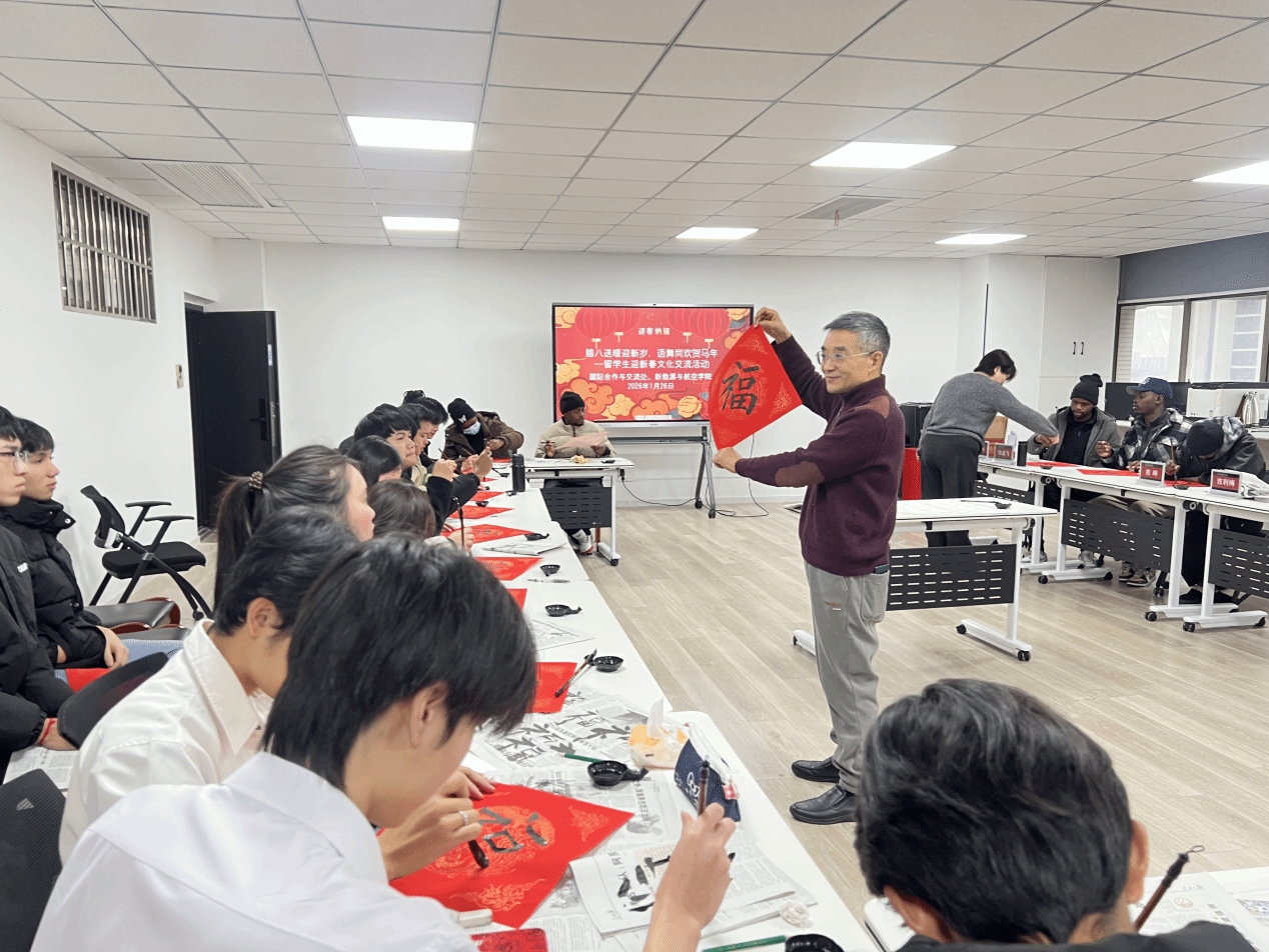 活动内容丰富、形式多样:留学生们挥毫书写“福”字,体验笔墨丹青中的年味;学说“马到成功”“一马当先”等春节祝福语,感受汉语魅力;欣赏由梦娜同学演唱的中文歌曲《童话》及老挝传统舞蹈,领略文化交融之美。除了沉浸式的文化体验外,活动现场还同步开展寒假安全教育、腊八节习俗讲解,并组织留学生签署《在校安全承诺书》,在传递节日温情的同时,筑牢留校学生的安全防线。