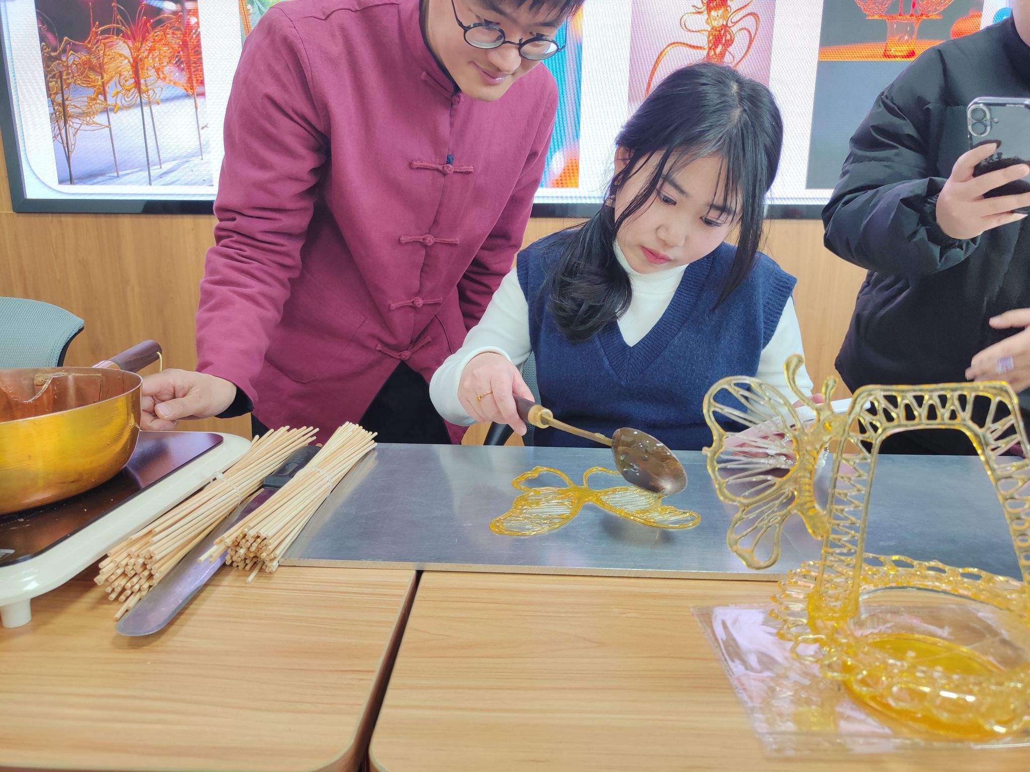 2月3日立春前夕,经济管理学院在致知楼604教室举办“糖丝连中老,画韵迎立春”非遗糖画文化宣讲与体验活动。活动特别邀请南通市级非物质文化遗产糖画项目传承人施剑锋老师主讲,学院党总支书记钱晋、党总支副书记沈峻锋、留学生班主任与全体留校老挝学生共同参与。