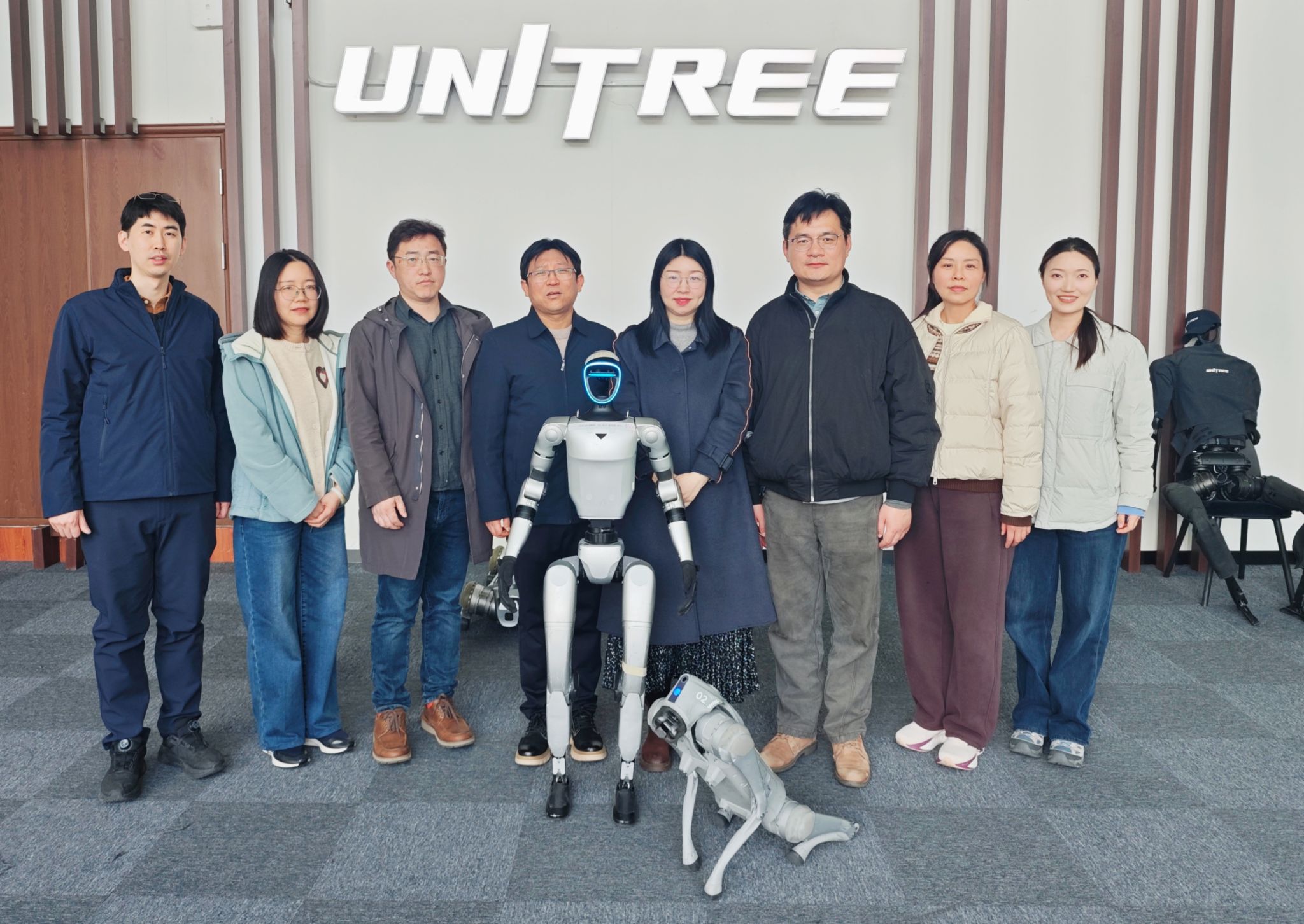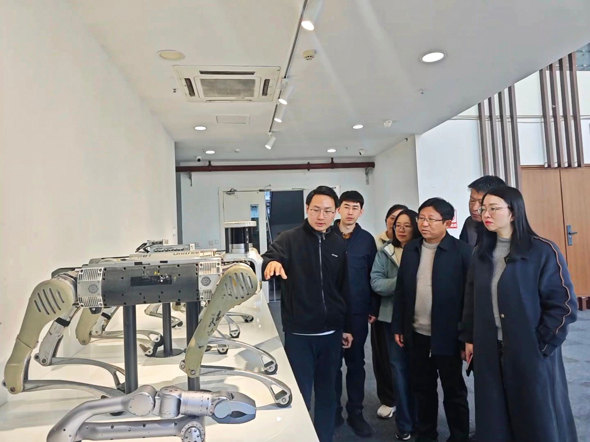 考察组首先赴宇树科技股份有限公司实地考察。该企业是国家级专精特新“小巨人”、全球足式机器人领军企业,也是国内少数实现核心部件全栈自研、规模化量产与商业化落地的仿生机器人企业,四足机器人全球市占率稳居前列,产品多次亮相央视春晚、冬奥会等顶级舞台。考察组在企业相关负责人指引下,实地了解企业发展历程、规划及核心业务,重点观摩企业在电机、减速器等核心部件自研、高性能运动控制算法研发上的硬核实力,直观感受工业级机器人在复杂场景的应用成果,精准对接智能制造领域岗位标准与技术要求,双方在校企人才联合培养、产教融合育人等方面达成初步共识。