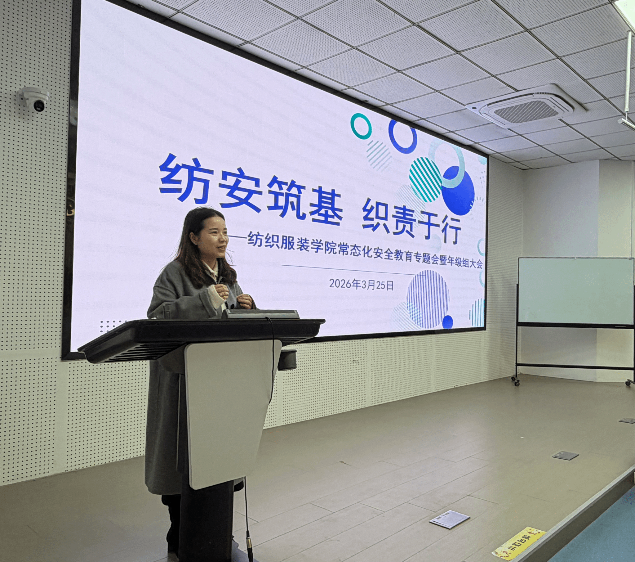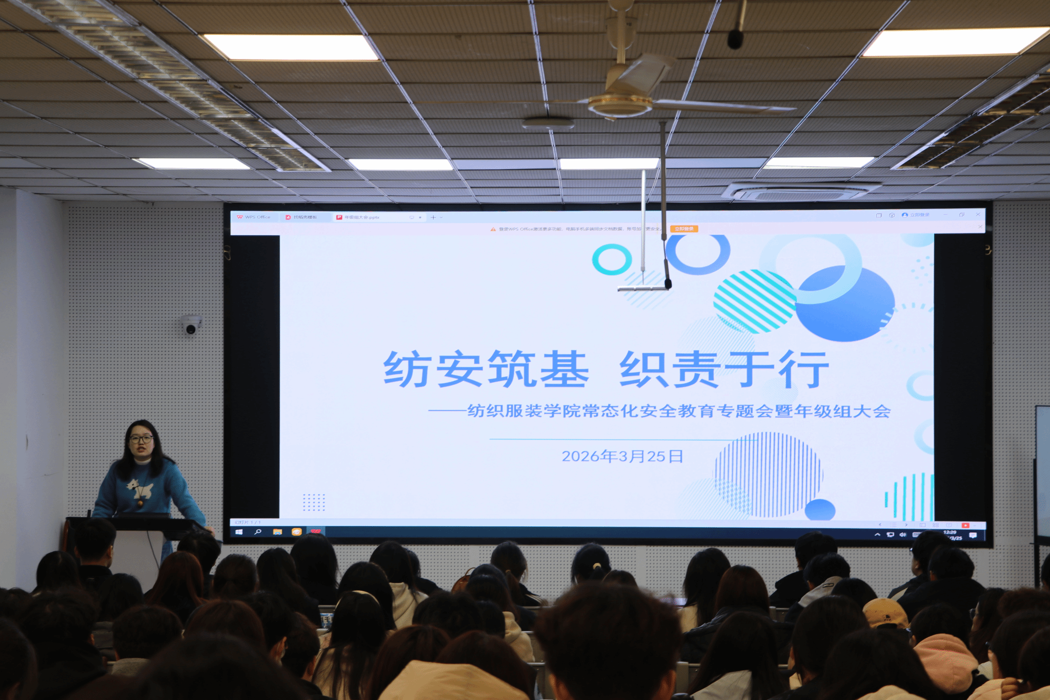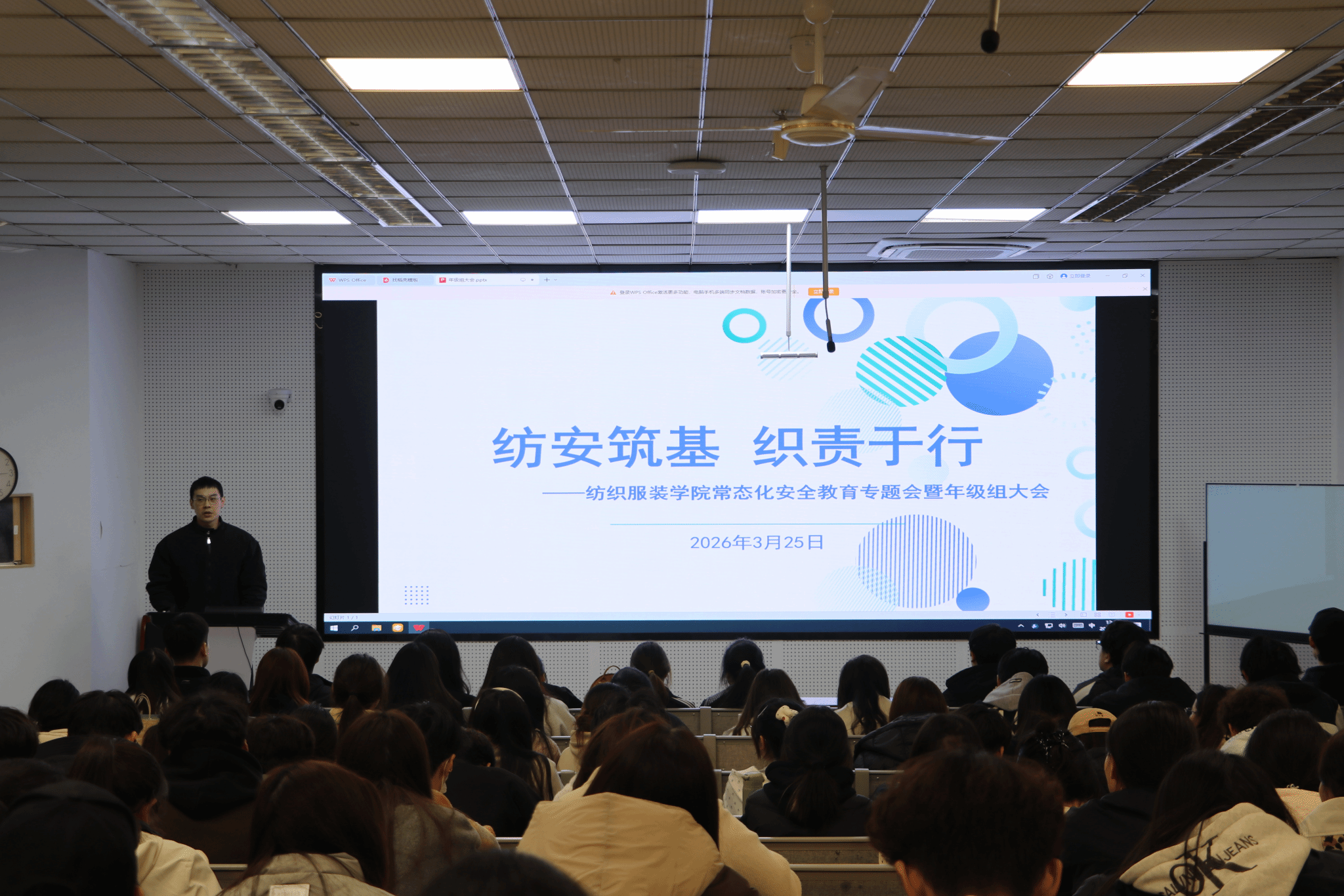 3月25日中午,纺织服装学院在致用楼100召开“纺安筑基,织责于行”期初常态化安全教育专题会暨年级组大会。学院党总支副书记周星星,24、25级年级组长沈慧、孟诗凯及200余名学生干部参加会议。