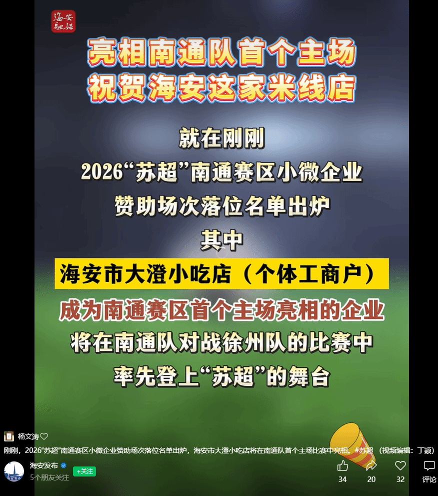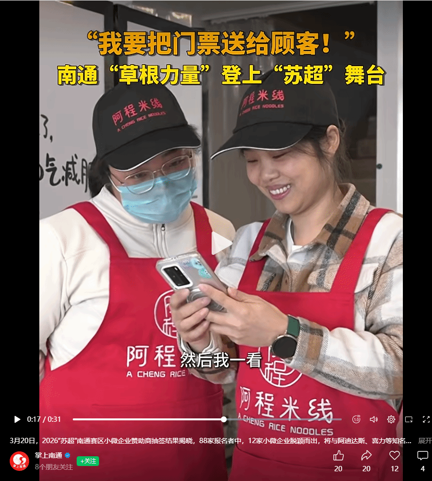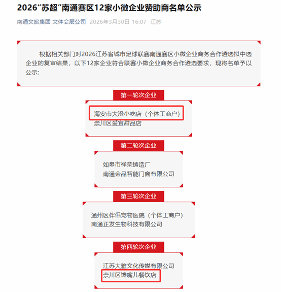 近日,根据南通文旅集团文体会展公司公示的“2026江苏省城市足球联赛南通赛区小微企业商务合作遴选拟中选企业”名单,我校优秀校友、南通中程餐饮管理有限公司负责人杨文涛先生旗下“阿程米线”品牌的两家加盟商,从众多企业中脱颖而出,成为南通赛区的商务合作伙伴。