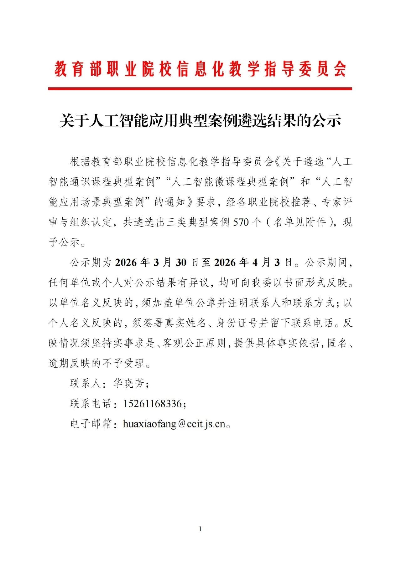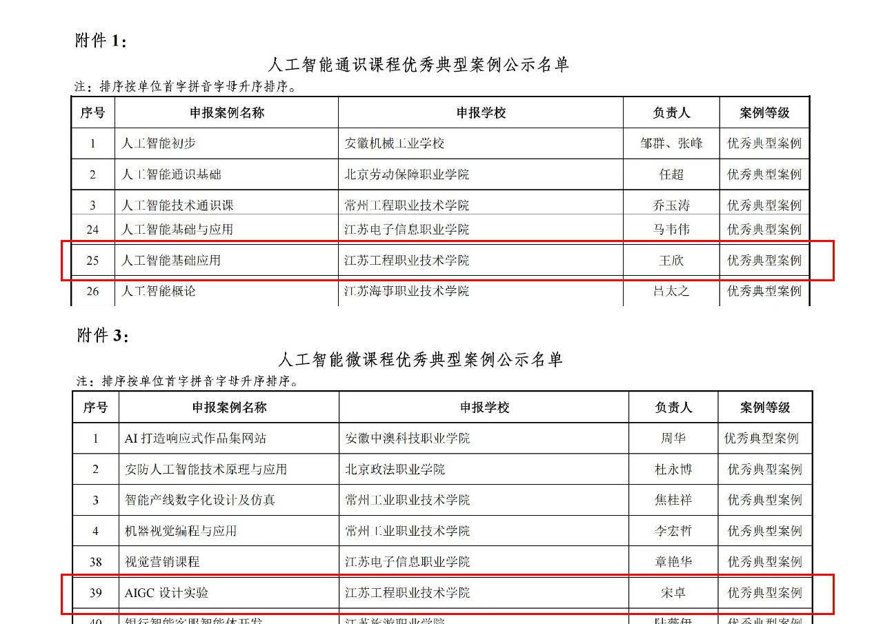 3月30日,教育部职业院校信息化教学指导委员会发布人工智能应用典型案例遴选结果的公示,我校上报的2项案例全部入选,其中《人工智能基础应用》(牵头申报人:王欣)案例入选人工智能通识课程优秀典型案例,《AIGC设计实验》(牵头申报人:宋卓)案例入选人工智能微课优秀典型案例。