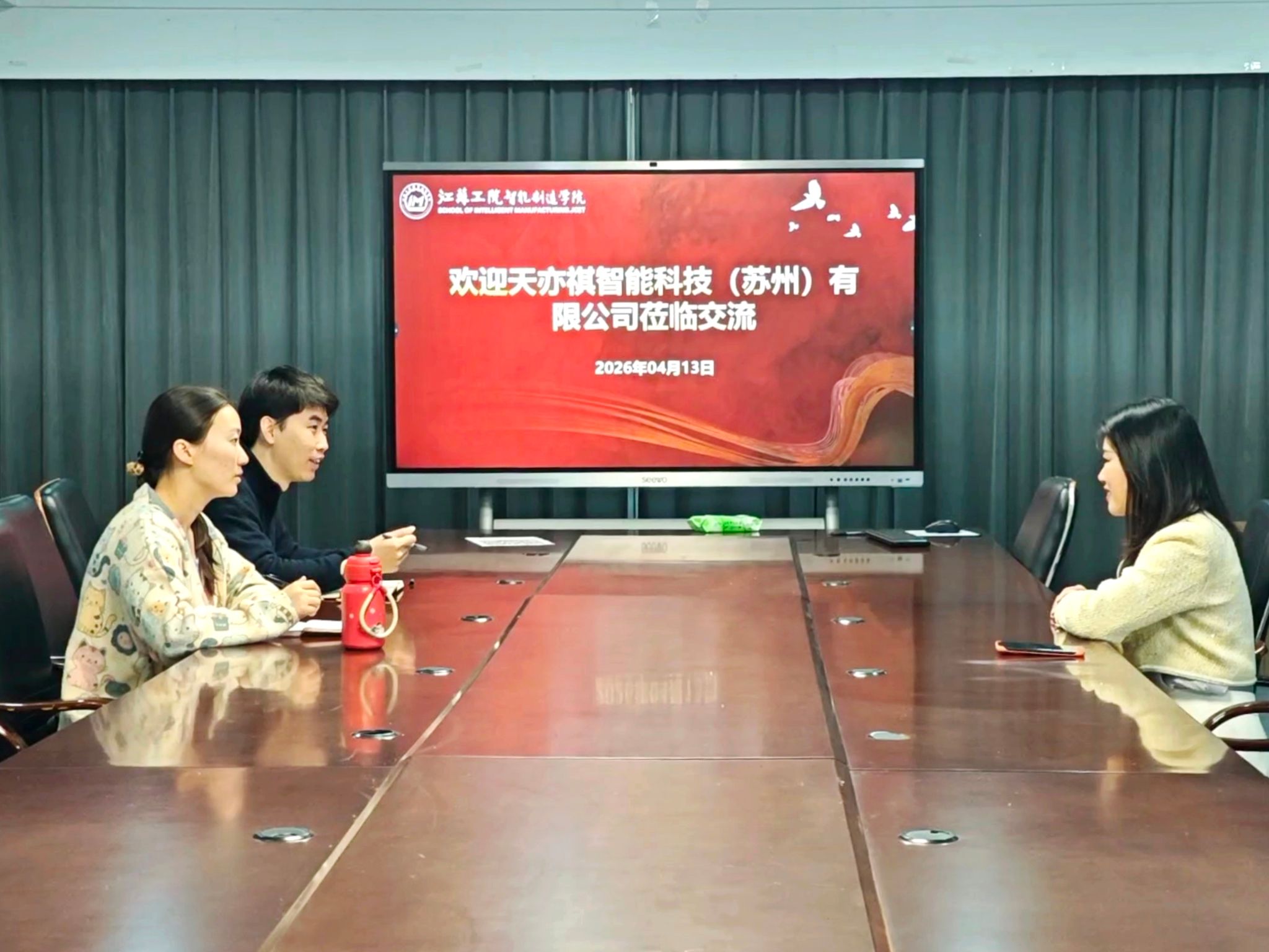 4月13日,天亦祺智能科技(苏州)有限公司总经理张玲应邀到访智能制造学院,就校企合作事宜展开专项洽谈。智能制造学院副院长毕书博、就业辅导员共同接待并参与座谈。